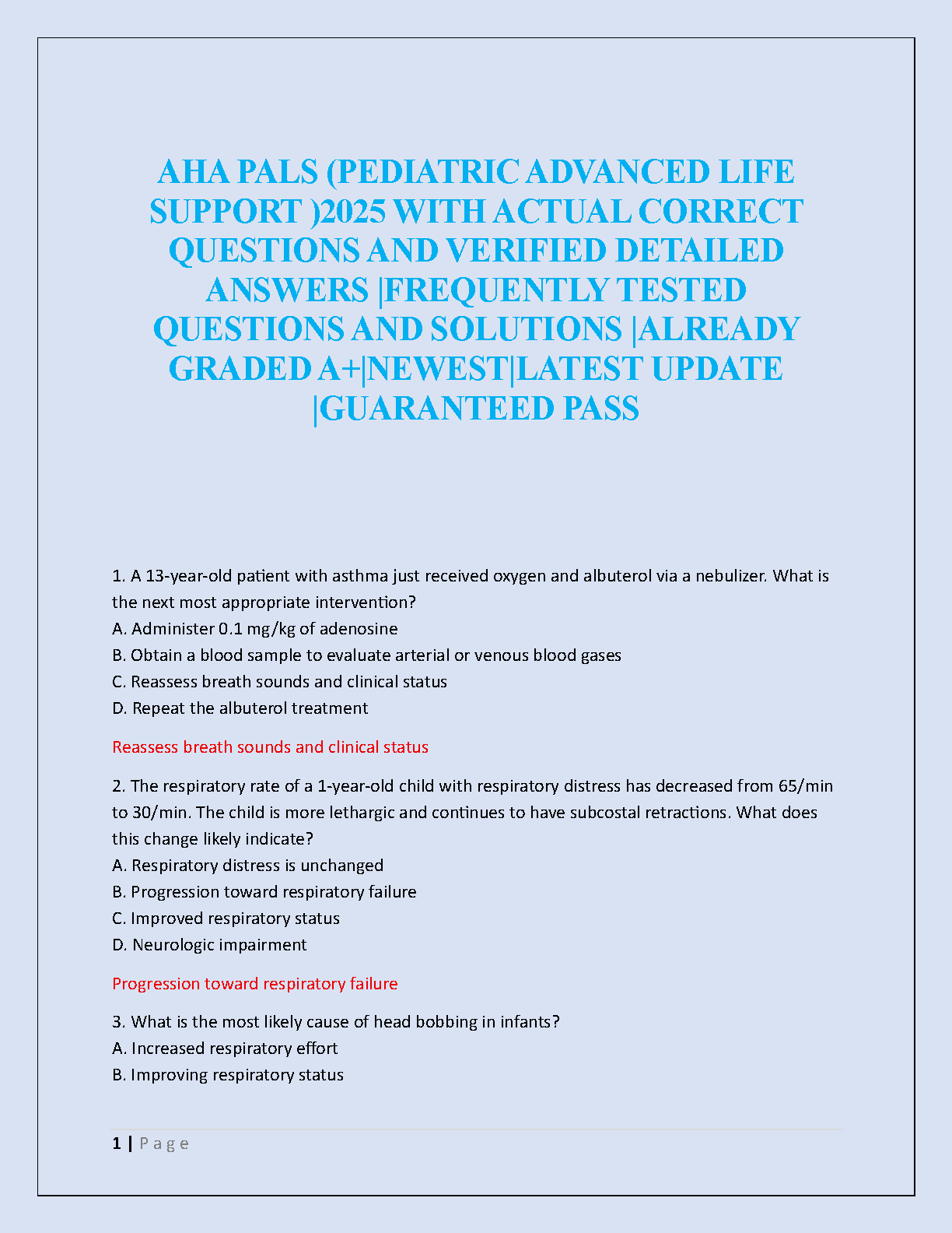 Ace your Pediatric Advanced Life Support (PALS) certification with our ultimate 2025 test bank, meticulously crafted from the latest American Heart Association (AHA) guidelines. This comprehensive resource is packed with hundreds of frequently tested questions, complete with verified, detailed answers and solutions. Designed to mirror the actual exam, this study guide covers all critical PALS scenarios, ensuring you're fully prepared to pass on your first attempt and avoid costly resits. Achieve an A+ grade and master the skills needed for pediatric emergencies with this guaranteed-to-pass resource.