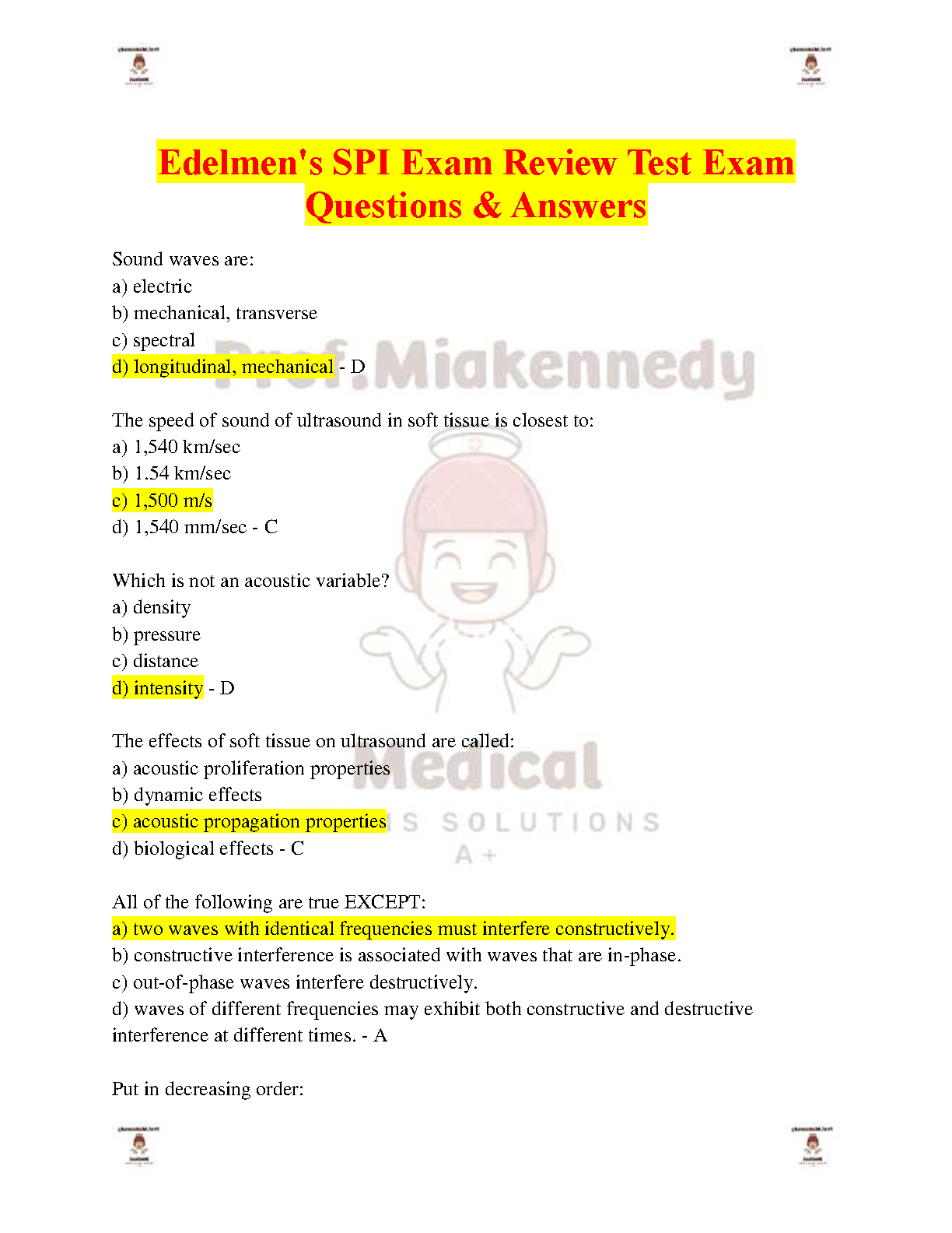 Ace your Sonography Principles and Instrumentation (SPI) board exam with this complete test bank for 'Understanding Ultrasound Physics,' 4th Edition by the renowned Sidney K. Edelman. This essential study resource provides an extensive collection of exam-style questions and verified answers, covering every critical topic from the textbook. Master complex concepts, identify your weak areas, and build the confidence you need to pass your SPI registry exam on the first try.