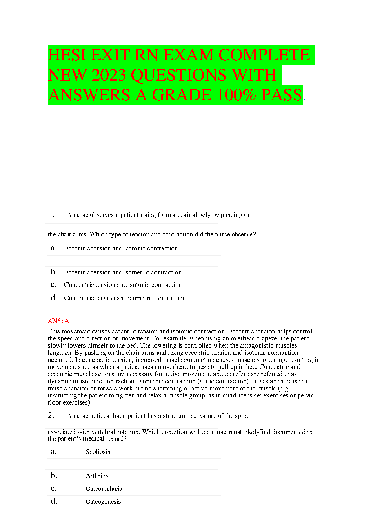 Ace your HESI Exit RN Exam with our comprehensive 2023-2024 test bank. This essential study guide features a complete collection of the latest exam questions, each accompanied by detailed, verified answers and rationales. Designed to mirror the actual test format, this resource helps you master critical nursing concepts, identify areas for improvement, and build the confidence needed to pass on your first attempt. Download now and take the final step towards becoming a Registered Nurse!