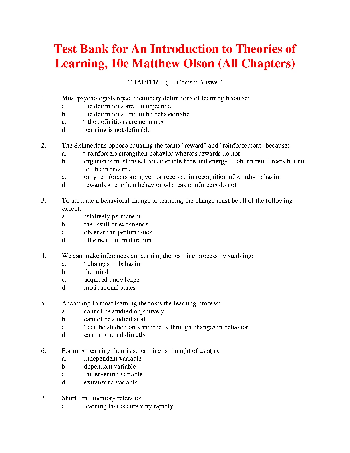 Test Bank for An Introduction to Theories of Learning, 10TH EDITION BY Matthew Olson (All Chapters)