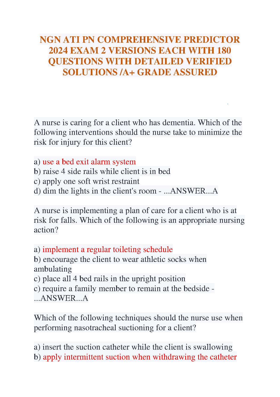 Master the NGN ATI PN Comprehensive Predictor Exam with our 2024 test bank. This essential study guide features two complete versions of the exam, each containing 180 practice questions with detailed, verified solutions and rationales. Designed to mirror the actual exam format, this resource is your key to achieving an A+ grade. Prepare effectively, build confidence, and ensure you pass your ATI PN predictor on the first attempt. Perfect for nursing students aiming for success in their PN program and preparing for the NCLEX-PN.