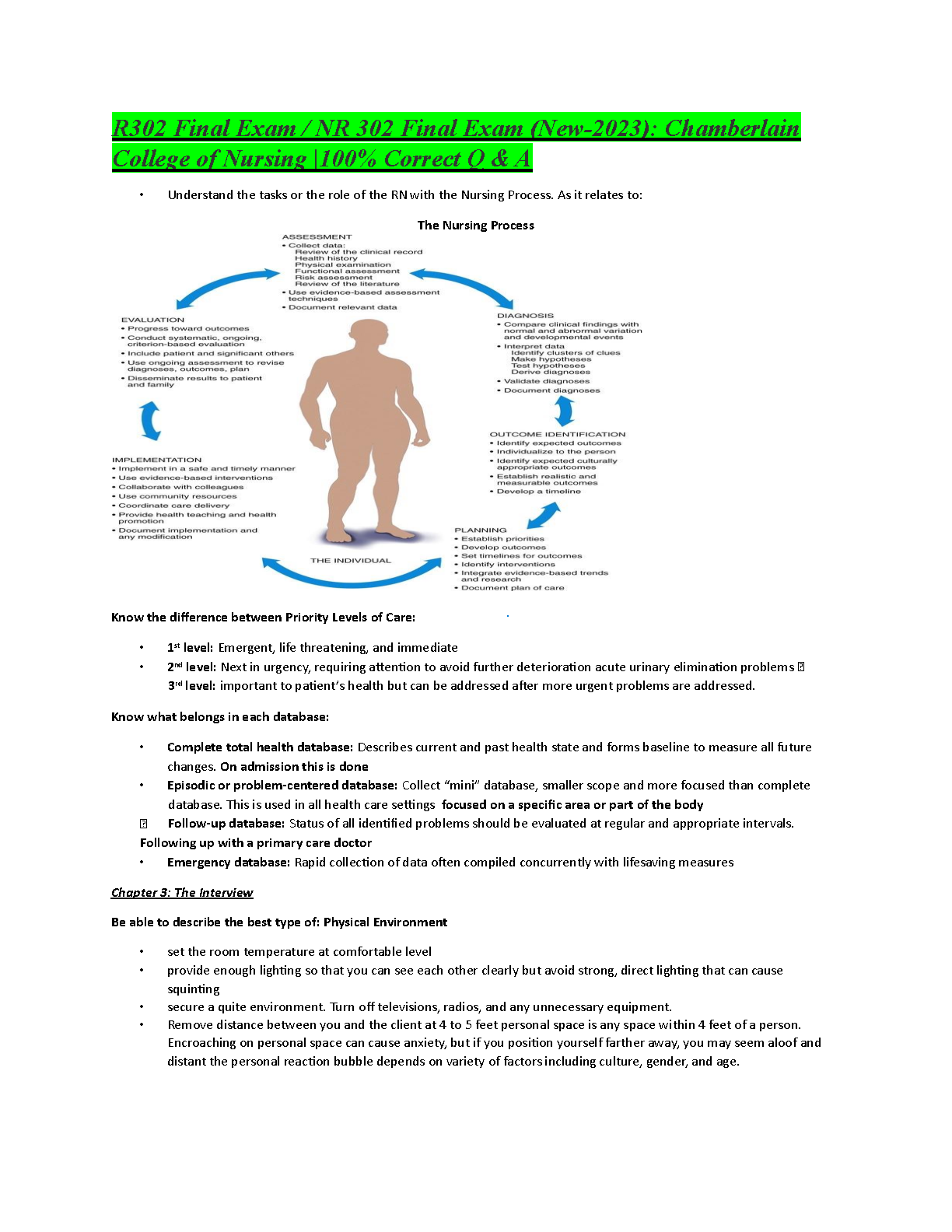 Unlock success in your NR 302 Final Exam at Chamberlain College of Nursing with our comprehensive 2025/2026 study guide. This detailed exam elaboration provides a thorough breakdown of essential topics, including The Nursing Process, Priority Levels of Care, types of health databases, and critical aspects of the patient interview. Expertly curated to ensure you grasp all key concepts, this resource is your ultimate tool to study effectively, avoid resits, and achieve a high score on your first try. Download now to master the material and excel in your Health Assessment course.