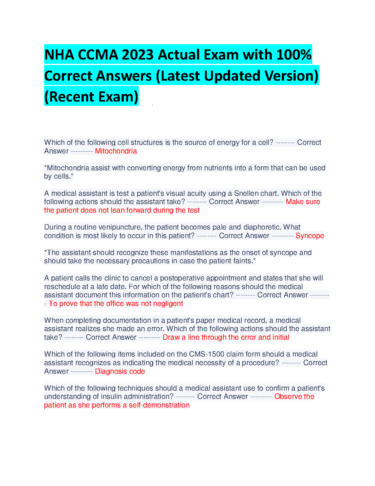 Unlock your potential and pass the NHA Certified Clinical Medical Assistant (CCMA) exam with confidence! This comprehensive test bank for the 2025/2026 academic year is your ultimate study tool. It features a collection of actual exam questions from recent tests, each paired with a 100% correct and verified answer. Our guide covers all critical topics you'll face, from patient care and clinical procedures to medical law and ethics. Designed to help you avoid resits, this resource provides the knowledge and practice you need to achieve certification on your very first attempt. Get immediate access to the latest updated material and start your journey to becoming a certified medical assistant today!