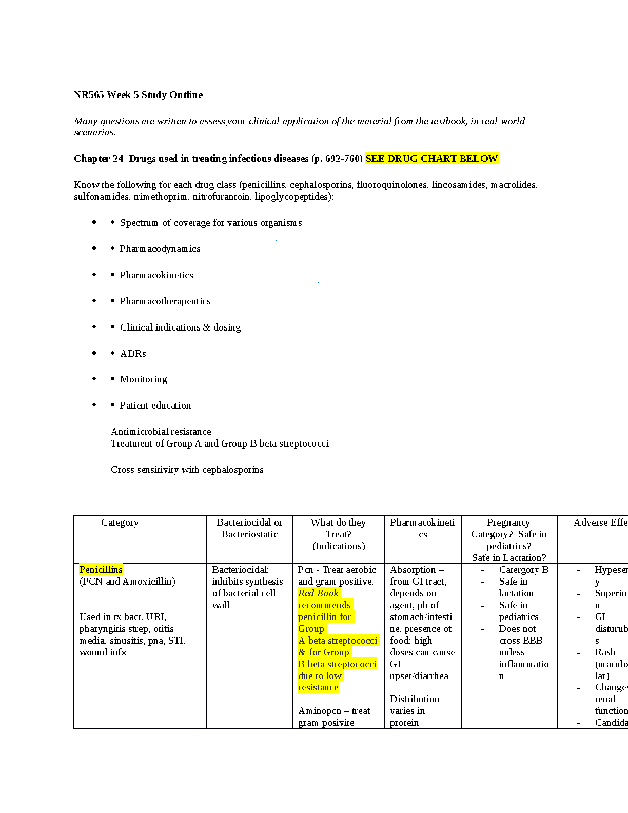 Get the ultimate edge in your NR565 Advanced Pharmacology course with this comprehensive Week 5 study outline and drug chart, fully updated for the 2025/2026 academic year. This guide meticulously covers Chapter 24: Drugs Used in Treating Infectious Diseases, based on 'Pharmacology for the Primary Care Provider, 6th Edition' by C. Lynne Edmunds and Maren Stewart Mayhew. It provides a detailed breakdown of key antibiotic classes, starting with penicillins. Each drug is summarized in an easy-to-read chart, covering pharmacokinetics, indications, adverse effects, and clinical monitoring. This resource is expertly crafted to help you master the material, apply clinical knowledge, and pass your exams with confidence on the very first attempt.