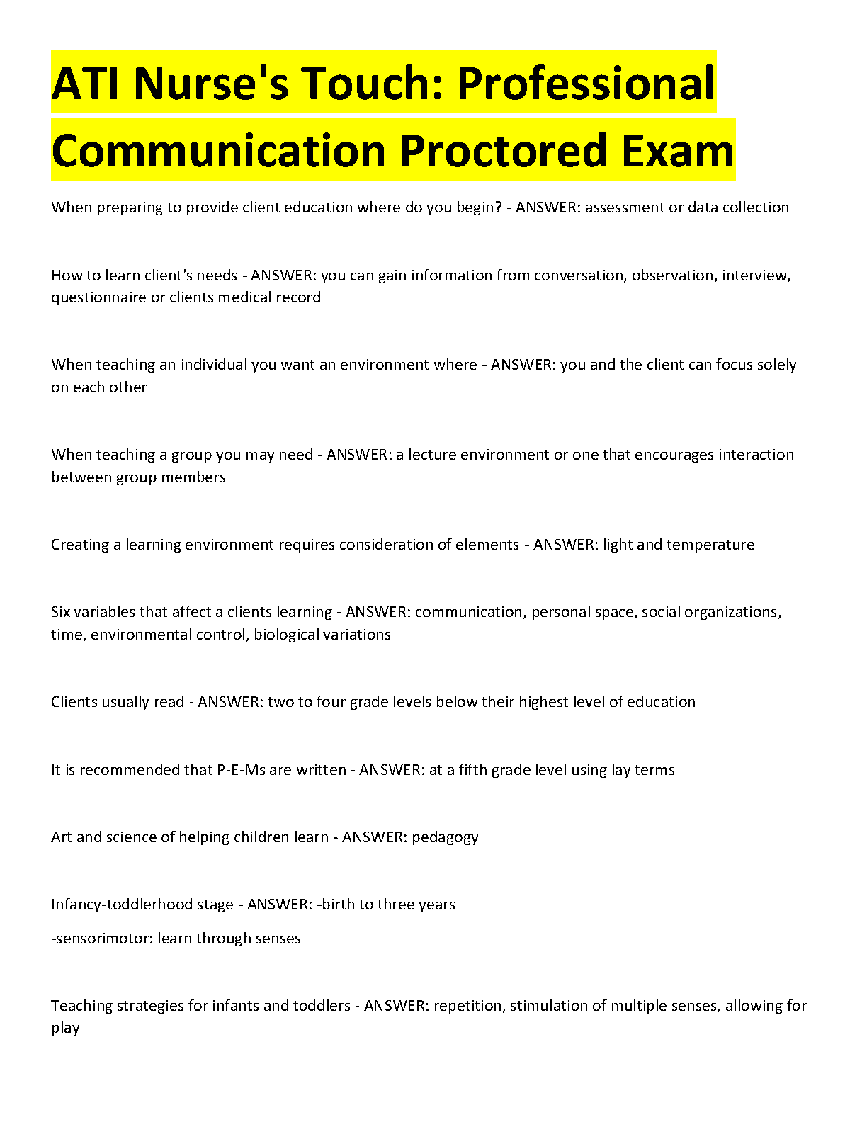 Ace your nursing exams with our comprehensive test bank for the ATI Nurse's Touch: Professional Communication Proctored Exam. This essential study guide provides a detailed collection of questions with verified answers, covering all critical topics you'll face on the exam. Master concepts such as effective client education, assessing learning needs, creating optimal teaching environments, and adapting communication strategies for different age groups. Designed to boost your confidence and ensure you're fully prepared, this resource is your key to passing the ATI proctored exam on your first attempt. Get instant access to the materials you need for success in your nursing program.