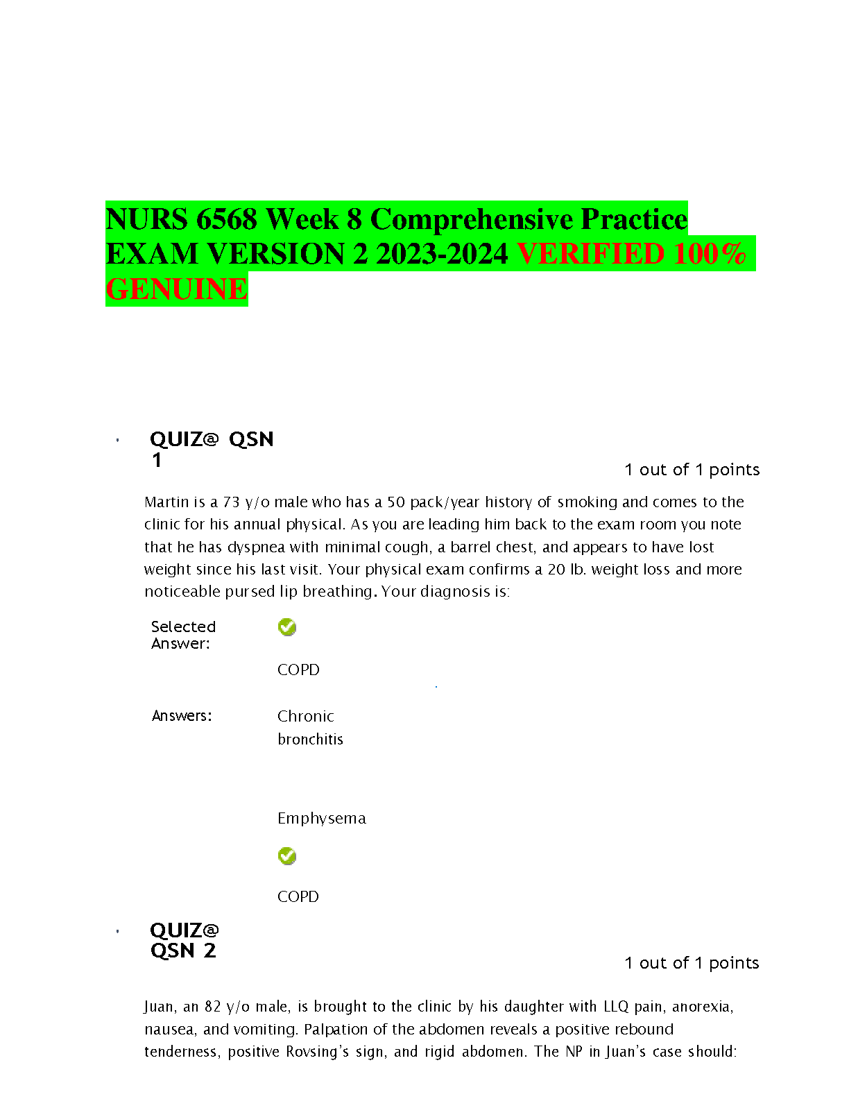Achieve top scores with the NURS 6568 Week 8 Comprehensive Practice Exam Version 2 Test Bank. This 2024 updated resource is meticulously verified, providing 100% correct questions and detailed answers to guarantee your success. Covering crucial topics through realistic clinical scenarios, this study guide is essential for mastering course concepts and passing your exam with confidence. Prepare effectively, understand key diagnoses, and walk into your test fully prepared. Ideal for nursing students aiming for excellence.