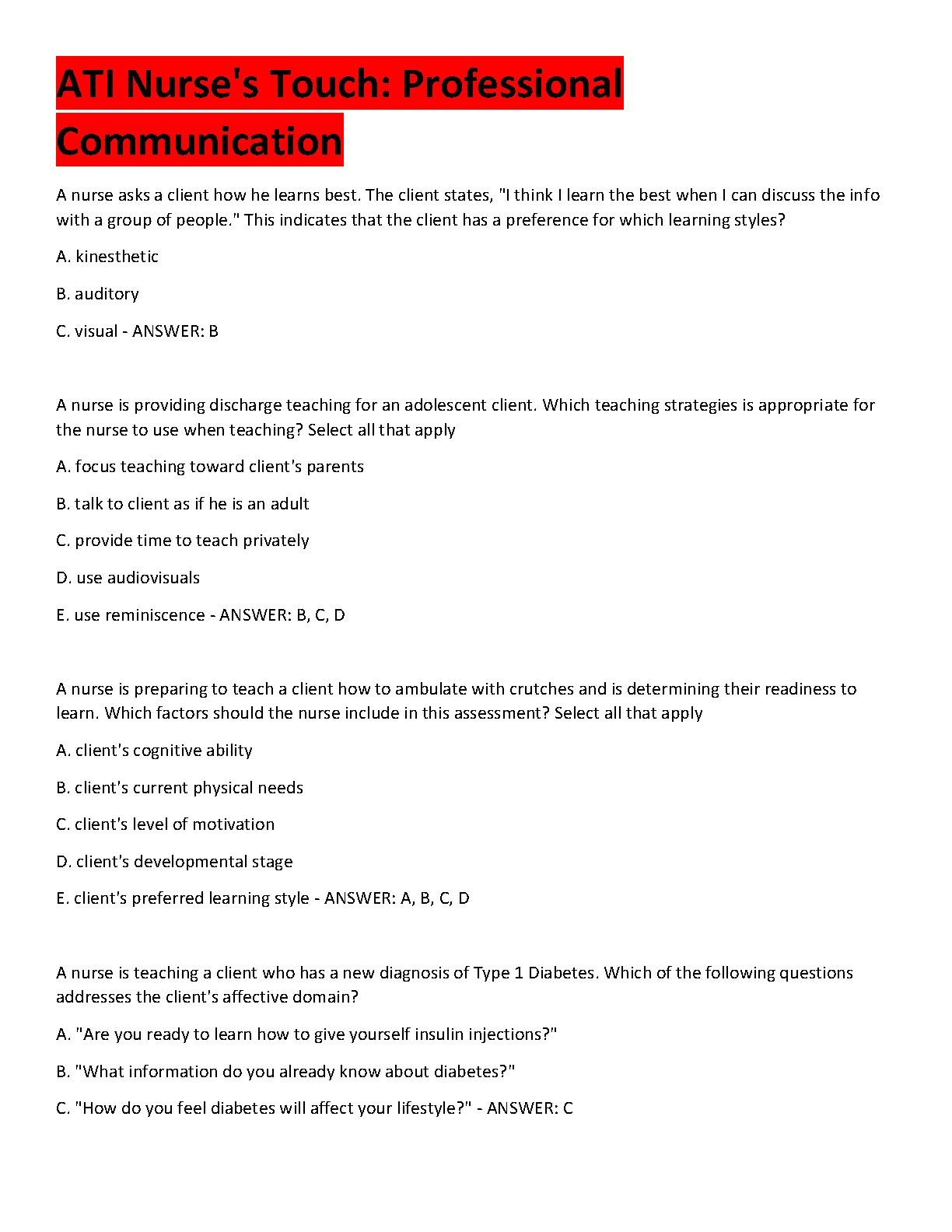 Ace your nursing exams with the comprehensive Test Bank for ATI Nurse's Touch: Professional Communication. This essential study guide provides a complete collection of practice questions, including multiple-choice and select-all-that-apply (SATA), each with a verified answer. Master key topics such as patient learning styles, therapeutic communication, discharge teaching strategies for various age groups, and assessing a client's readiness to learn. Designed for nursing students aiming for success, this resource is your key to deeply understanding professional communication principles and passing your ATI and NCLEX exams on the first try.