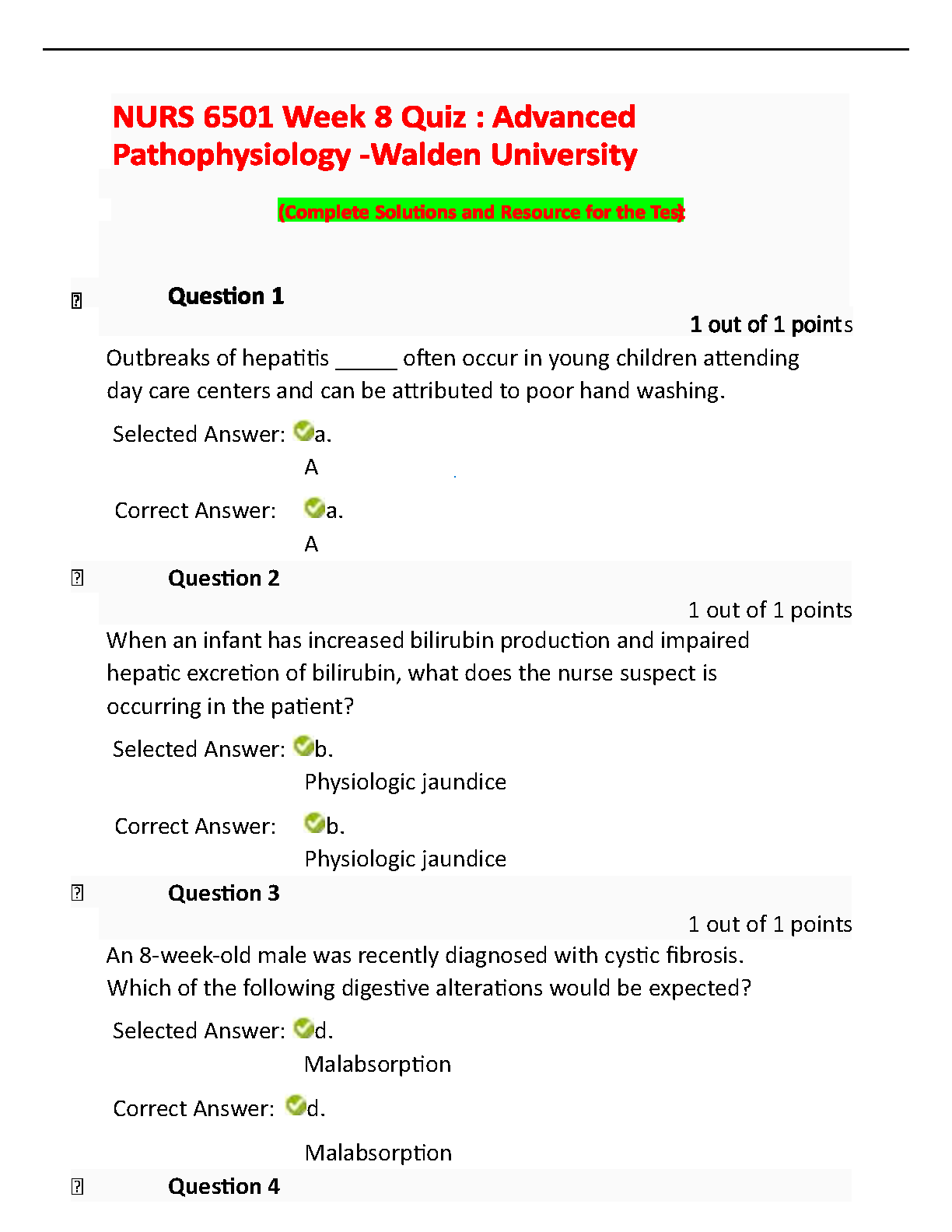 Unlock your potential in NURS 6501 Advanced Pathophysiology at Walden University with this comprehensive test bank for the Week 8 Quiz. This guide features a complete set of verified questions with 100% correct answers, directly aligned with the core textbook, 'Pathophysiology: The Biologic Basis for Disease in Adults and Children, 8th Edition' by Kathryn L. McCance and Sue E. Huether. Master complex concepts, prepare effectively for your assessments, and secure top grades to pass on your first attempt.