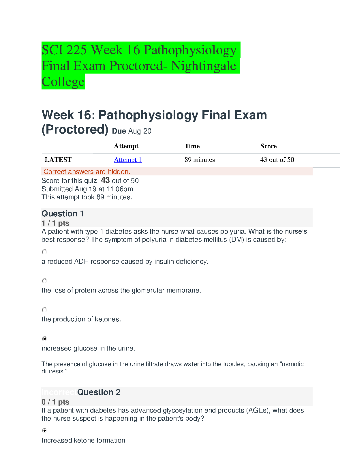 Struggling with SCI 225 Pathophysiology at Nightingale College? Get the ultimate advantage with our comprehensive study guide for the Week 16 Proctored Final Exam. This latest 2025/2026 resource is meticulously crafted to help you master complex topics and understand the exam format inside and out. It features questions and detailed explanations based on the actual exam, ensuring you walk into your test with confidence. Avoid the stress of resits and secure a top grade on your first try. Download now and start your journey to acing your Pathophysiology final!