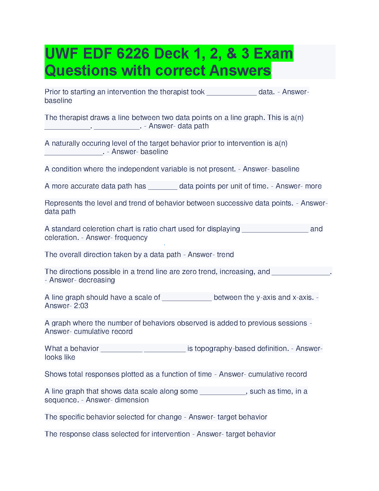 Prepare to ace your UWF EDF 6226 Single Case Research Design exam with this complete test bank covering Decks 1, 2, and 3. This study guide features a comprehensive collection of exam questions paired with 100% correct and verified answers. Master essential topics like baseline data, data paths, trend analysis, cumulative records, and definitions of behavior. This resource is expertly crafted to help you study effectively, build confidence, and pass your exam with a high score. Get the edge you need for academic success in EDF 6226.