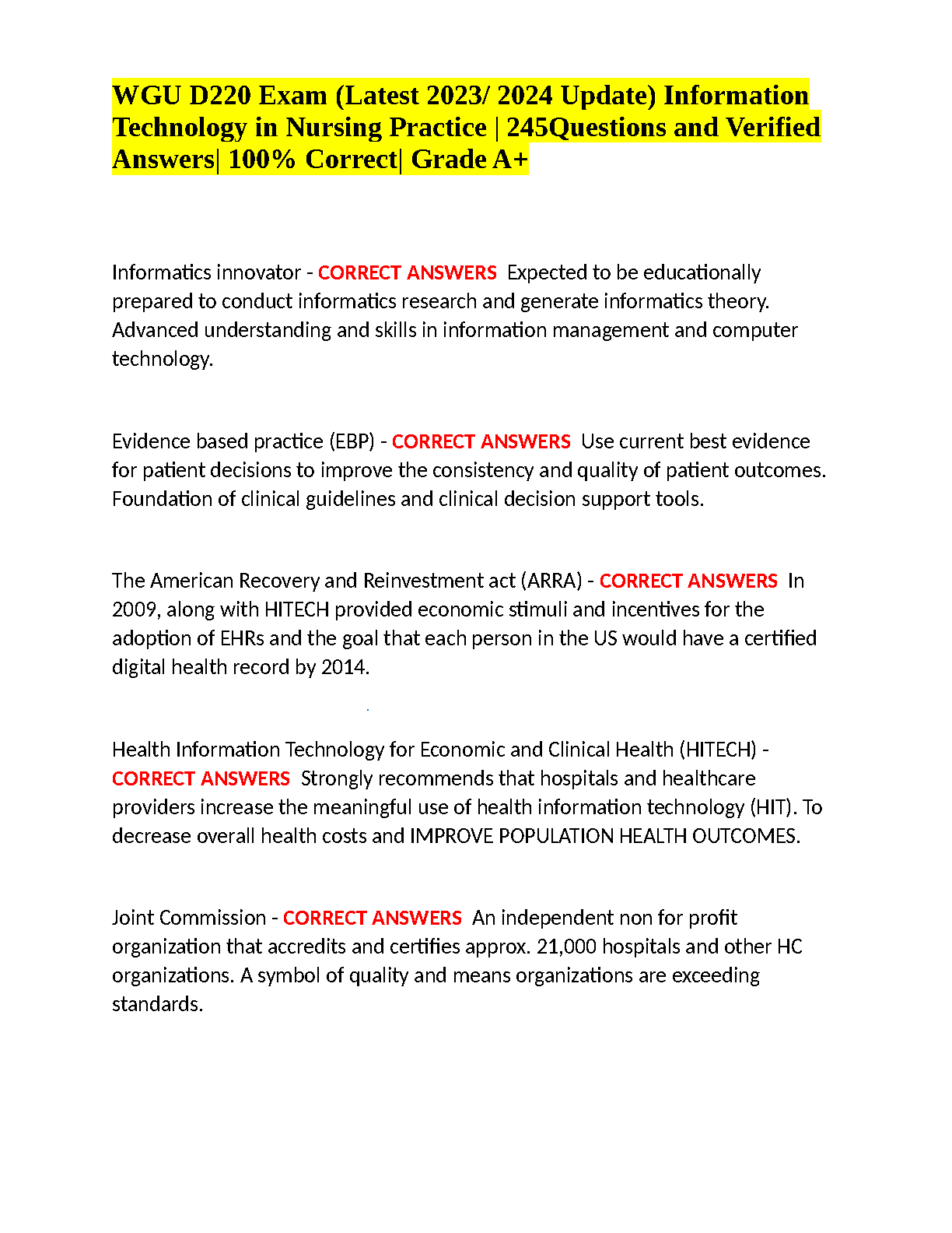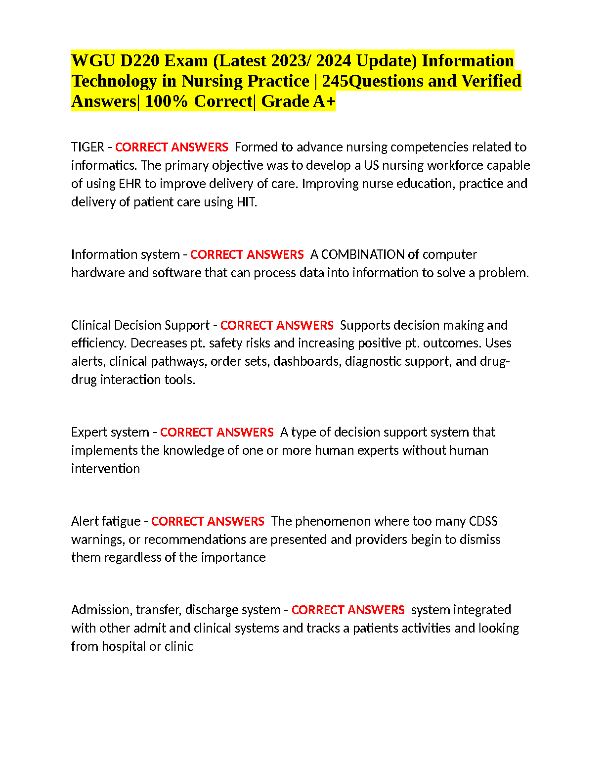 Excel in your WGU D220 exam on Information Technology in Nursing Practice with our latest 2025/2026 test bank. This guide is packed with 245 expertly verified questions and detailed answers, covering all critical topics from nursing informatics to data management. It's the ultimate resource designed to help you master the course material, guarantee a Grade A+, and pass on your first attempt, eliminating the need for resits. Download now and confidently prepare for success.