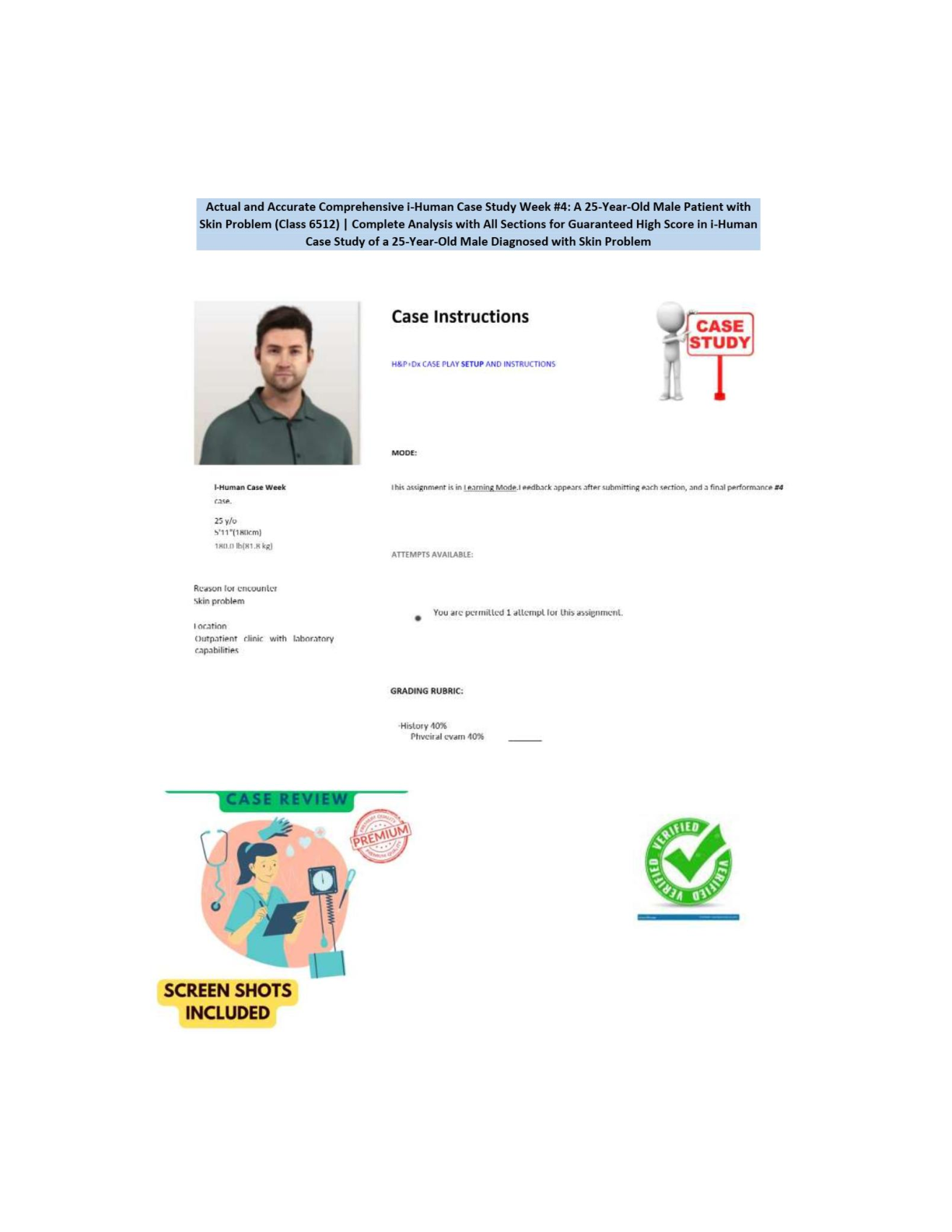 Master your i-Human assignment with our latest 2025/2026 guide for the Week 4 Case Study (Class 6512). This resource provides a complete, step-by-step analysis of the 25-year-old male patient presenting with a skin problem. Featuring detailed explanations and screenshots for all sections, this study guide is expertly crafted to ensure you achieve a high score and pass your exam on the first try. Avoid resits and gain confidence with this verified and accurate solution.
