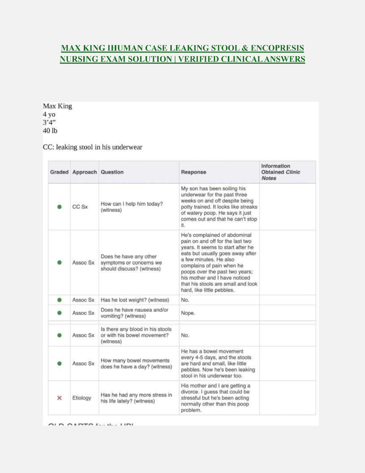 Unlock success in your nursing studies with this comprehensive solution guide for the iHuman case study of Max King, focusing on Leaking Stool & Encopresis. This verified resource, updated for the 2025/2026 academic year, provides detailed clinical answers and a step-by-step approach to the patient assessment. It's expertly designed to help you master the material, ace your exams on the first attempt, and avoid costly resits.