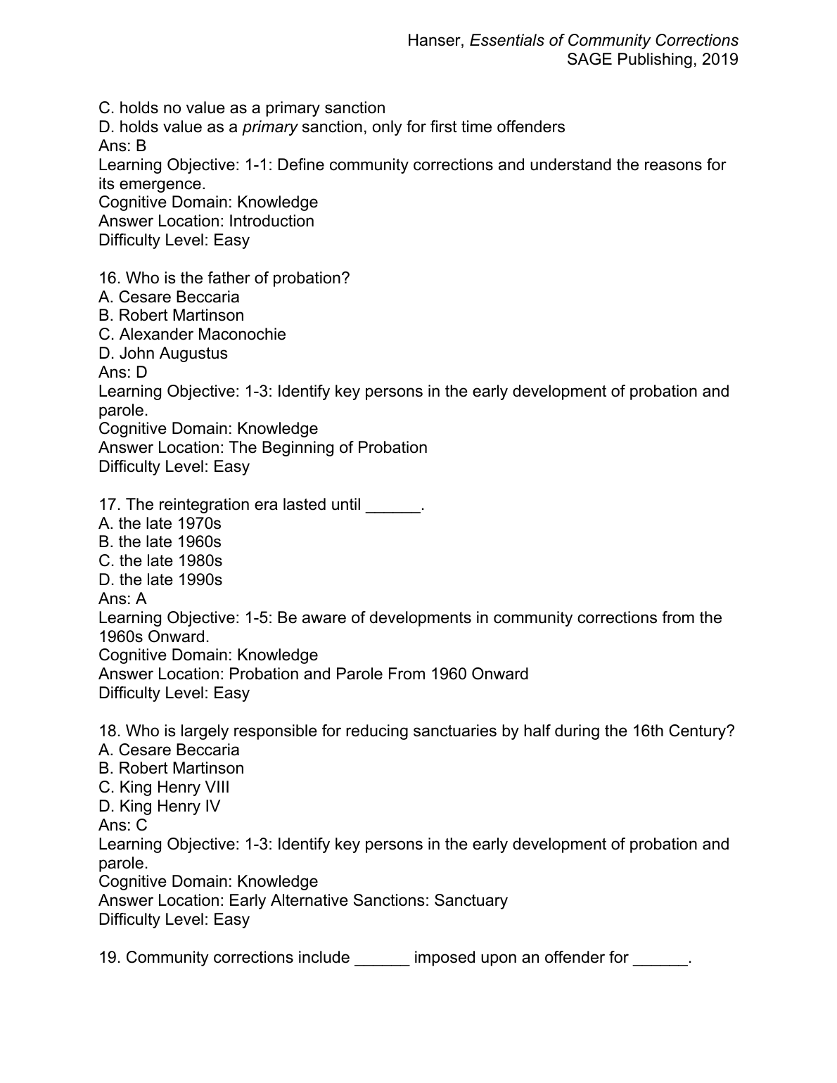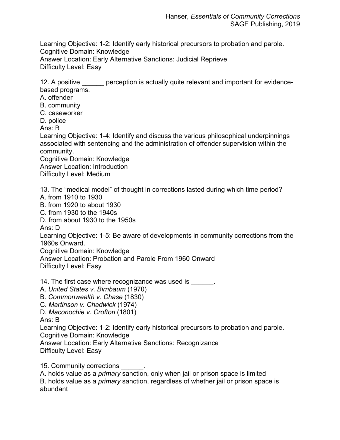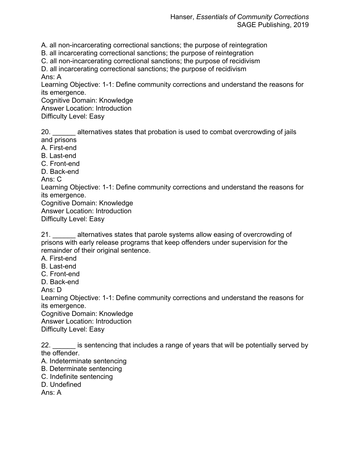 Hanser, Essentials of Community Corrections SAGE Publishing, TEST BANK