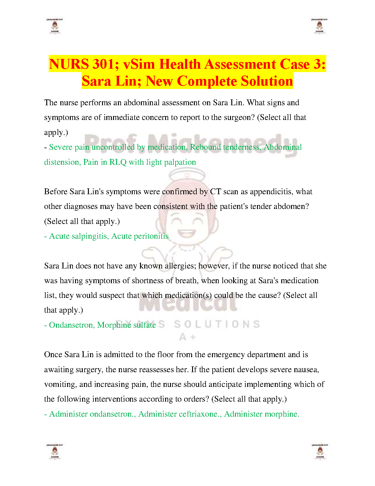Get the complete, A+ graded solution for NURS 301 vSim Health Assessment Case 3: Sara Lin. This 2025/2026 test bank provides detailed answers to help you master the simulation, covering critical topics like abdominal assessment for appendicitis, prioritizing nursing interventions, and medication management. This essential study guide is designed to help you ace your exams and pass on your first attempt. Instantly download the verified solutions to excel in your nursing course.