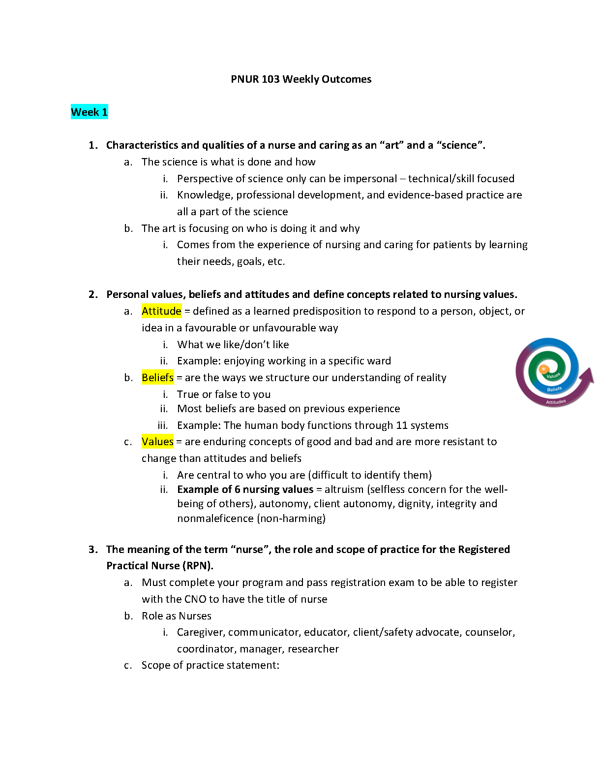 Struggling with the foundational concepts of your PNUR 103 course? This comprehensive study guide for Week 1 is expertly crafted to help you master the essential weekly outcomes and excel in your exams. Dive deep into the core principles of the nursing profession, exploring its dual nature as both an 'art' and a 'science'. This guide clearly defines and explains crucial concepts such as personal values, beliefs, and attitudes, providing a solid framework for your future practice. It specifically breaks down key nursing values including altruism, autonomy, dignity, integrity, and nonmaleficence. Plus, gain a clear understanding of the role and scope of practice for a Registered Practical Nurse (RPN). Fully updated for the 2025/2026 academic year, these notes are your ultimate tool to build a strong foundation, pass your exams on the first attempt, and confidently start your nursing journey.