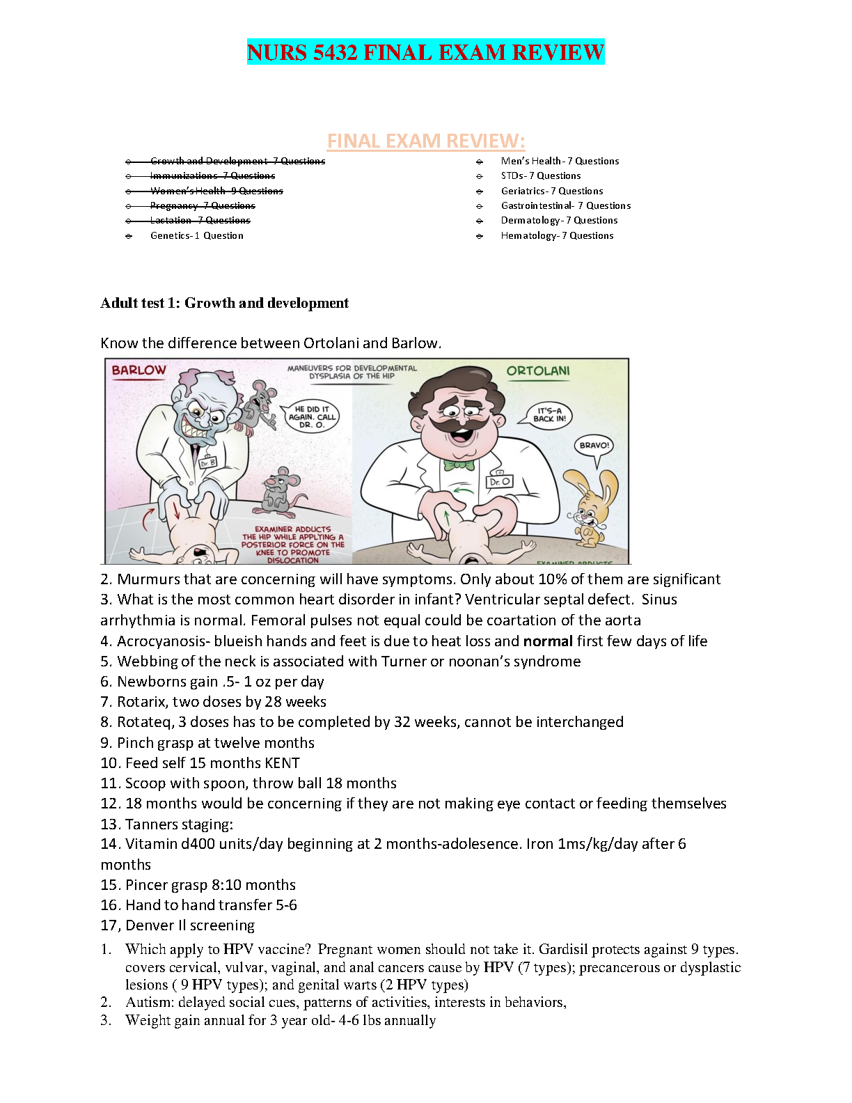 Unlock success in your NURS 5432 final exam with this comprehensive and up-to-date study guide for the 2025/2026 academic year. This detailed exam elaboration breaks down all essential topics, ensuring you're fully prepared. Dive deep into key areas including Growth and Development, Women's and Men's Health, Geriatrics, Immunizations, and more. This guide simplifies complex concepts, such as the Ortolani and Barlow maneuvers, HPV vaccine guidelines, and critical developmental milestones. It's the perfect resource to streamline your revision, boost your confidence, and help you pass your final exam on the very first attempt, avoiding costly resits. Get the essential notes you need to excel!