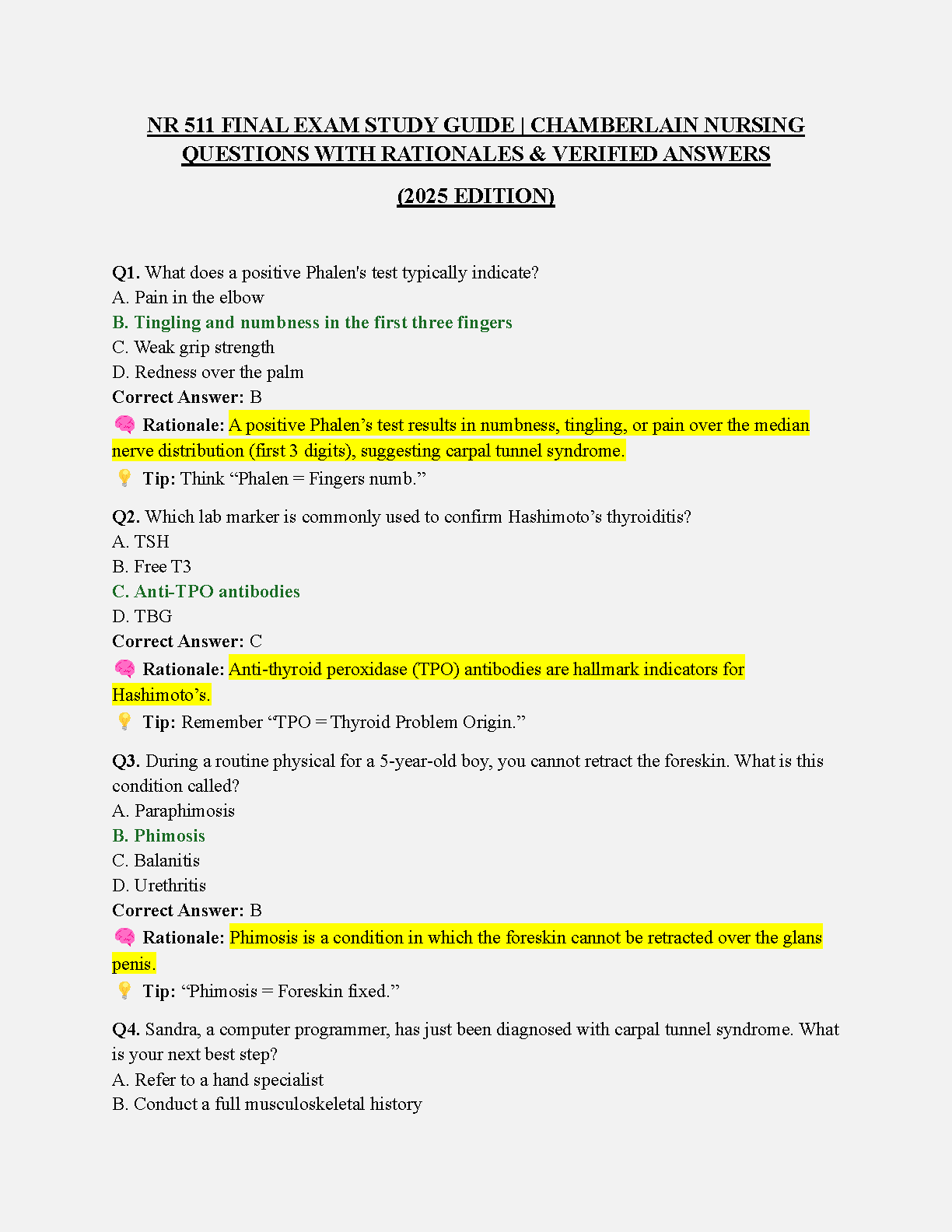 NR 511 Final Exam Test Bank, 2025 Edition | Chamberlain Nursing | Comprehensive Questions with Verified Answers & Rationales