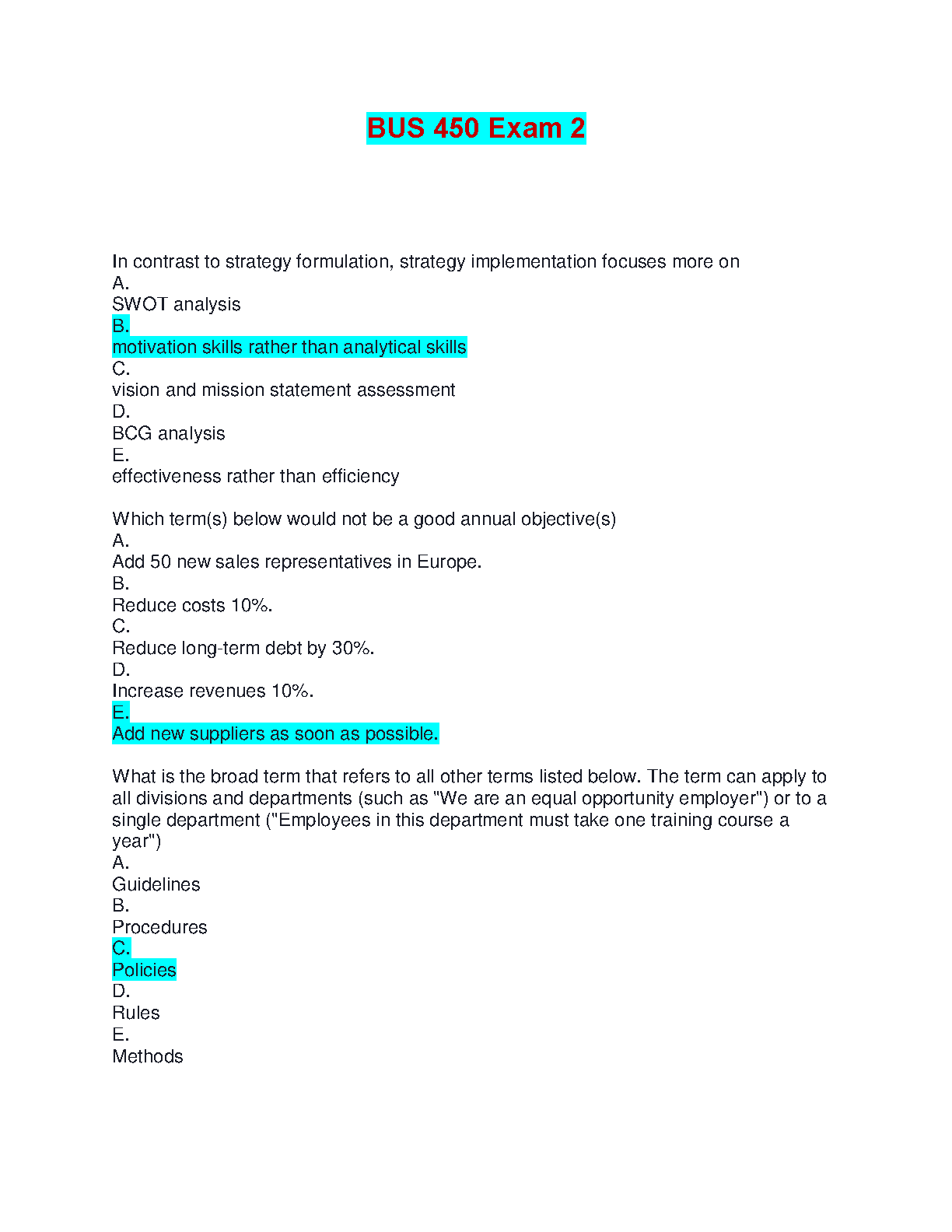 Ace your BUS 450 Exam 2 with this comprehensive test bank for 'Strategic Management: A Competitive Advantage Approach, 17th Edition' by Fred R. David and Forest R. David. This resource provides a complete collection of multiple-choice questions and verified answers, directly aligned with your course material. Master key concepts in strategy implementation, setting annual objectives, and corporate policies. This digital test bank is your ultimate study partner, designed to help you practice effectively, understand complex topics, and secure a top grade on your exam. Download now to start preparing and pass with confidence!
