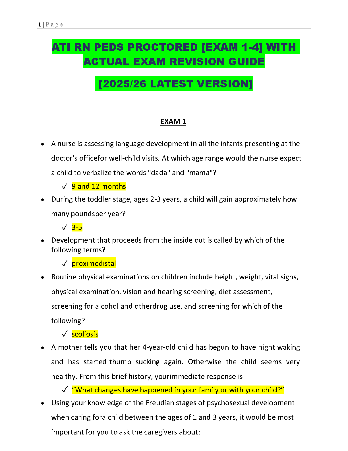 Excel in your pediatric nursing course with our comprehensive test bank for the ATI RN Peds Proctored Exam. This essential study resource, fully updated for the 2025/2026 academic year, provides a detailed review of Exams 1-4. Featuring a wide range of actual exam-style questions with verified, accurate answers, this guide is designed to help you master critical concepts, from developmental milestones to psychosocial theories. Prepare effectively, boost your confidence, and pass your exams on the first try, avoiding costly resits.