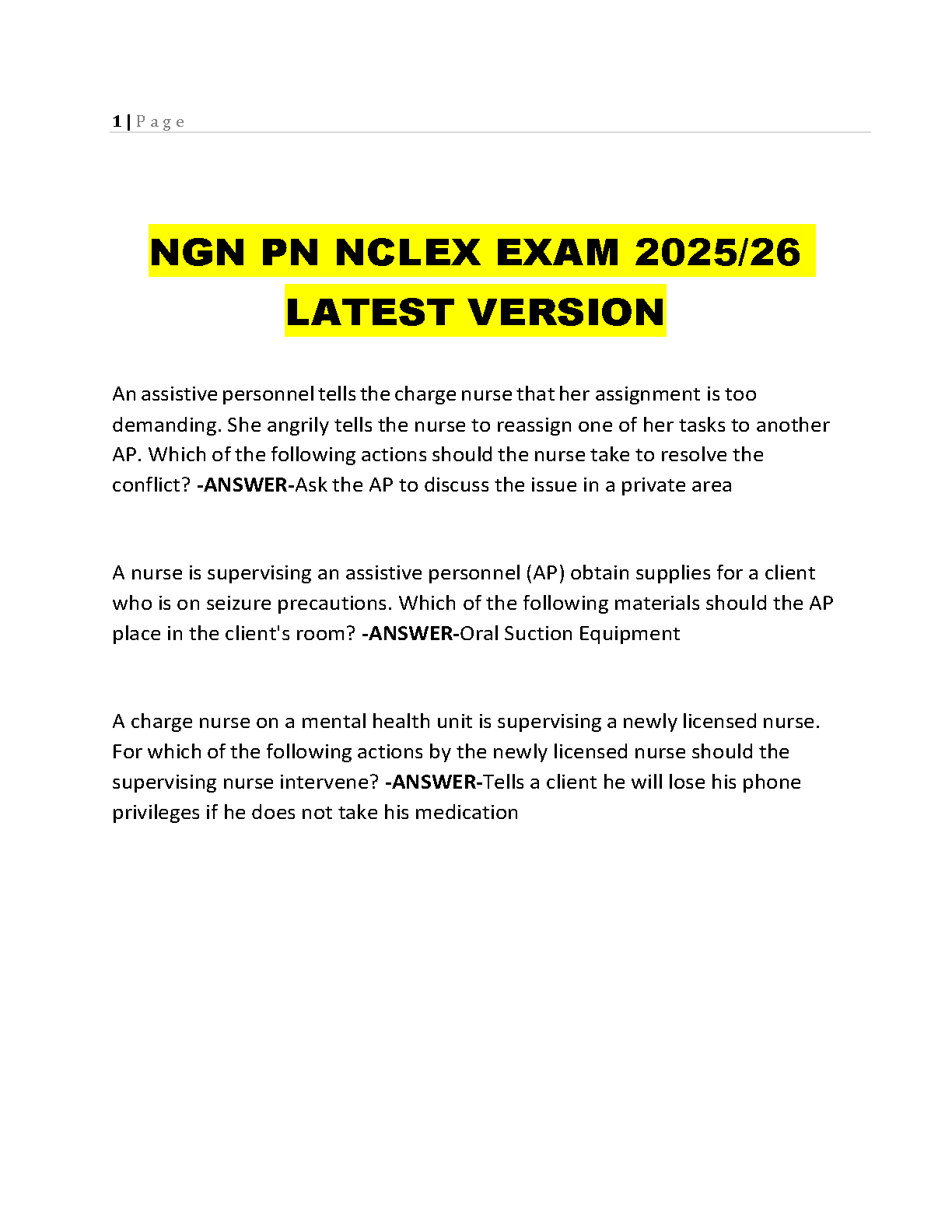 Unlock your path to becoming a Practical Nurse with our ultimate NGN PN NCLEX Exam Prep for the 2025-2026 academic year. This meticulously compiled test bank features the latest Next-Generation NCLEX style questions, complete with accurate and concise answers. Dive into realistic clinical scenarios covering delegation, patient safety, mental health, and more. This essential study guide is designed to sharpen your critical thinking skills and build the confidence you need to pass the NCLEX-PN on your very first attempt, saving you from the stress and cost of resits. Get instant access and start preparing for success today!