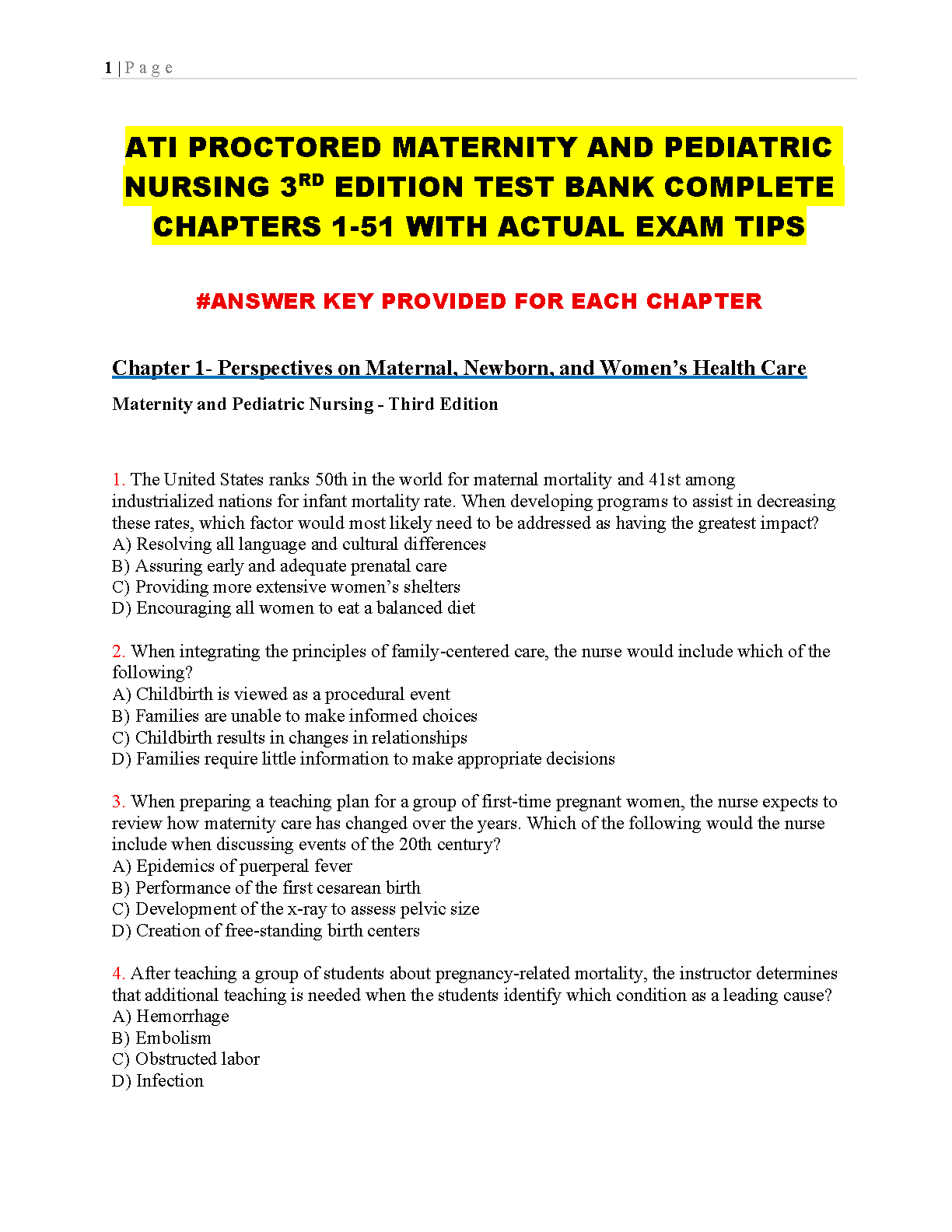 Unlock your full potential with the complete Test Bank for the 3rd Edition of 'Maternity and Pediatric Nursing' by Ricci, Kyle, and Carman. This essential study guide covers all 51 chapters, providing detailed questions and verified answers that mirror the ATI Proctored exam format. Enhance your understanding, master key concepts, and prepare effectively to excel in your nursing course and pass your exams with confidence. Includes actual exam tips for strategic preparation.