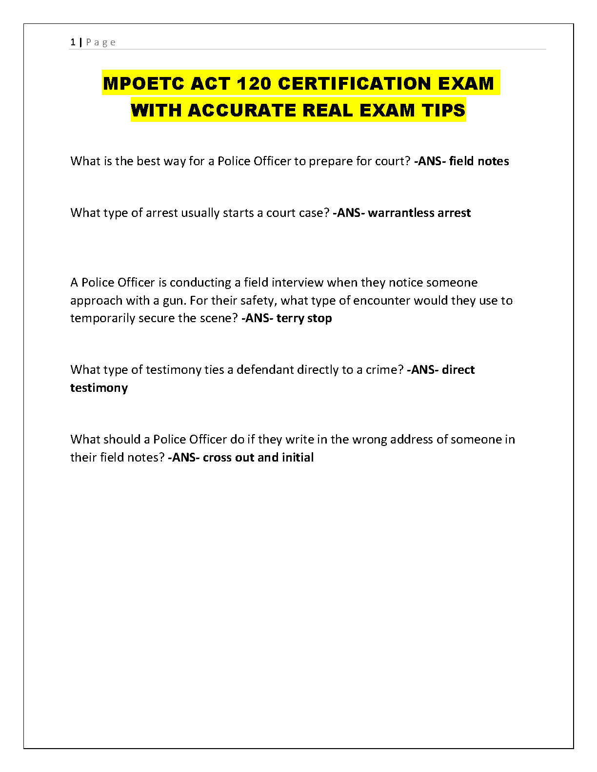 Ace your MPOETC Act 120 Certification Exam with our comprehensive and up-to-date test bank, expertly designed for the 2025-2026 testing cycle. This essential study resource provides a complete collection of real exam questions with verified, accurate answers. Master key topics in law enforcement procedure, including court preparation, arrest protocols, field interviews like the Terry stop, and rules of evidence. Our Q&A format is crafted to help you study efficiently, build confidence, and pass the Pennsylvania police officer certification on your very first attempt. Avoid resits and launch your law enforcement career with the best preparation tool available.