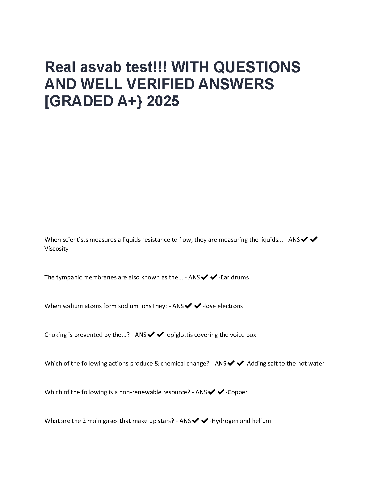 Ace the Armed Services Vocational Aptitude Battery (ASVAB) on your first attempt with our comprehensive 2025 Test Bank. This essential study guide features a complete collection of real exam questions accompanied by well-verified, A+ graded answers. Prepare effectively, master the key concepts, and walk into your military entrance test with confidence. This resource is designed to help you avoid resits and achieve the high score you need for your desired military career.