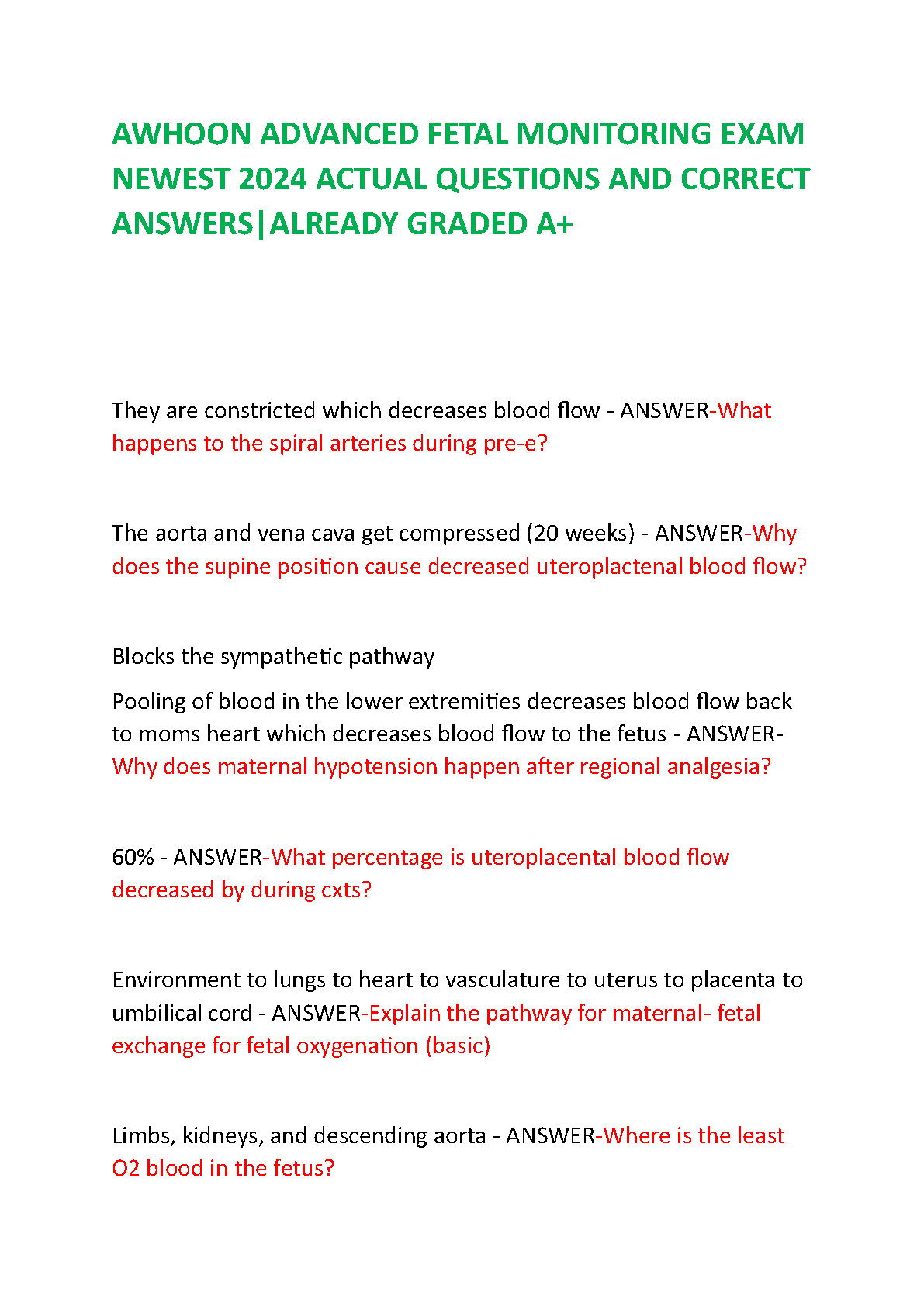AWHONN Advanced Fetal Monitoring Exam Test Bank 2024 | Verified Questions and Answers for a Guaranteed A+