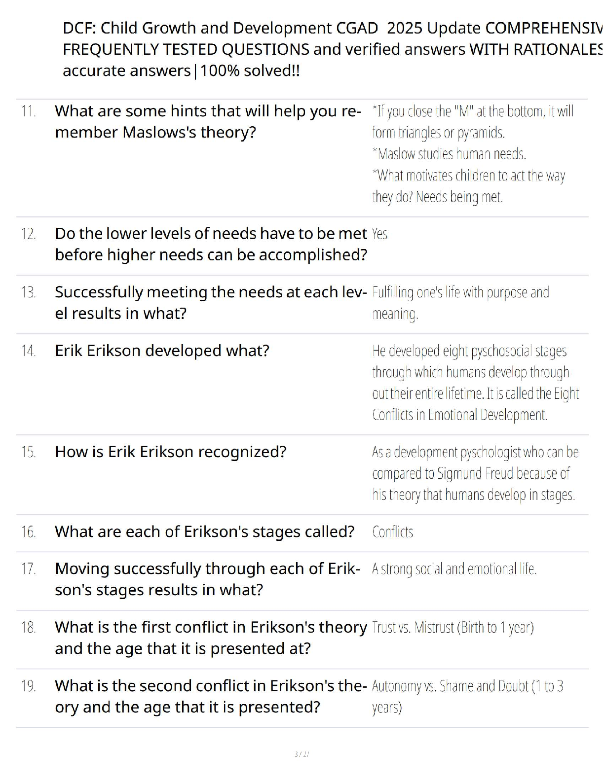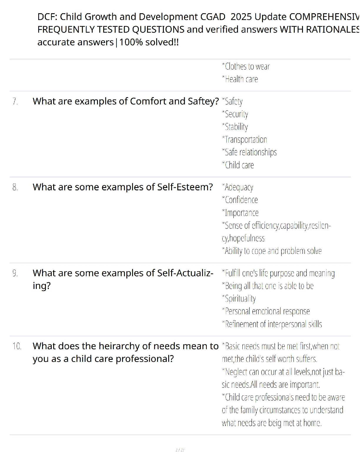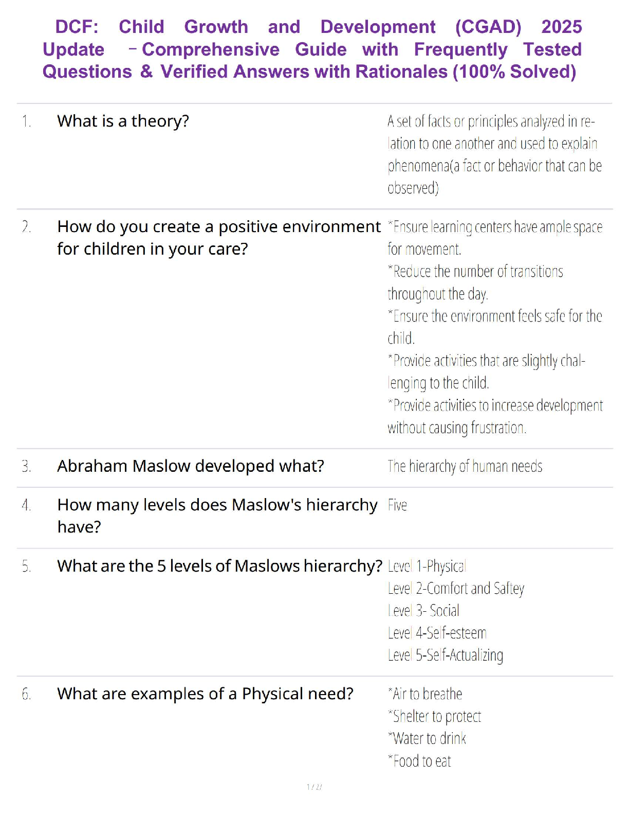 Master the DCF Child Growth and Development (CGAD) exam with our newly updated 2025 test bank. This comprehensive study guide is packed with frequently tested questions, each accompanied by a verified, 100% correct answer and detailed rationale. Covering key topics from foundational theories like Maslow's hierarchy of needs to practical applications such as creating a positive environment for children, this resource is your ultimate tool for success. Prepare efficiently, understand the core concepts, and pass your DCF CGAD certification on the first attempt with confidence. Avoid resits and fast-track your professional development today!