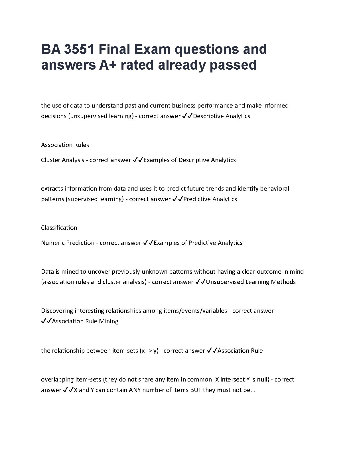 Ace your BA 3551 Final Exam with this comprehensive test bank! This A+ rated study guide provides a complete set of verified questions and detailed answers, covering all essential topics for your Business Analytics course. Master key concepts such as Descriptive and Predictive Analytics, Supervised and Unsupervised Learning, Association Rules, Cluster Analysis, and Data Mining. This resource is expertly designed to help you understand complex topics, practice with real exam-style questions, and achieve top grades. Stop guessing and start studying with confidence. Download now to secure your A+!