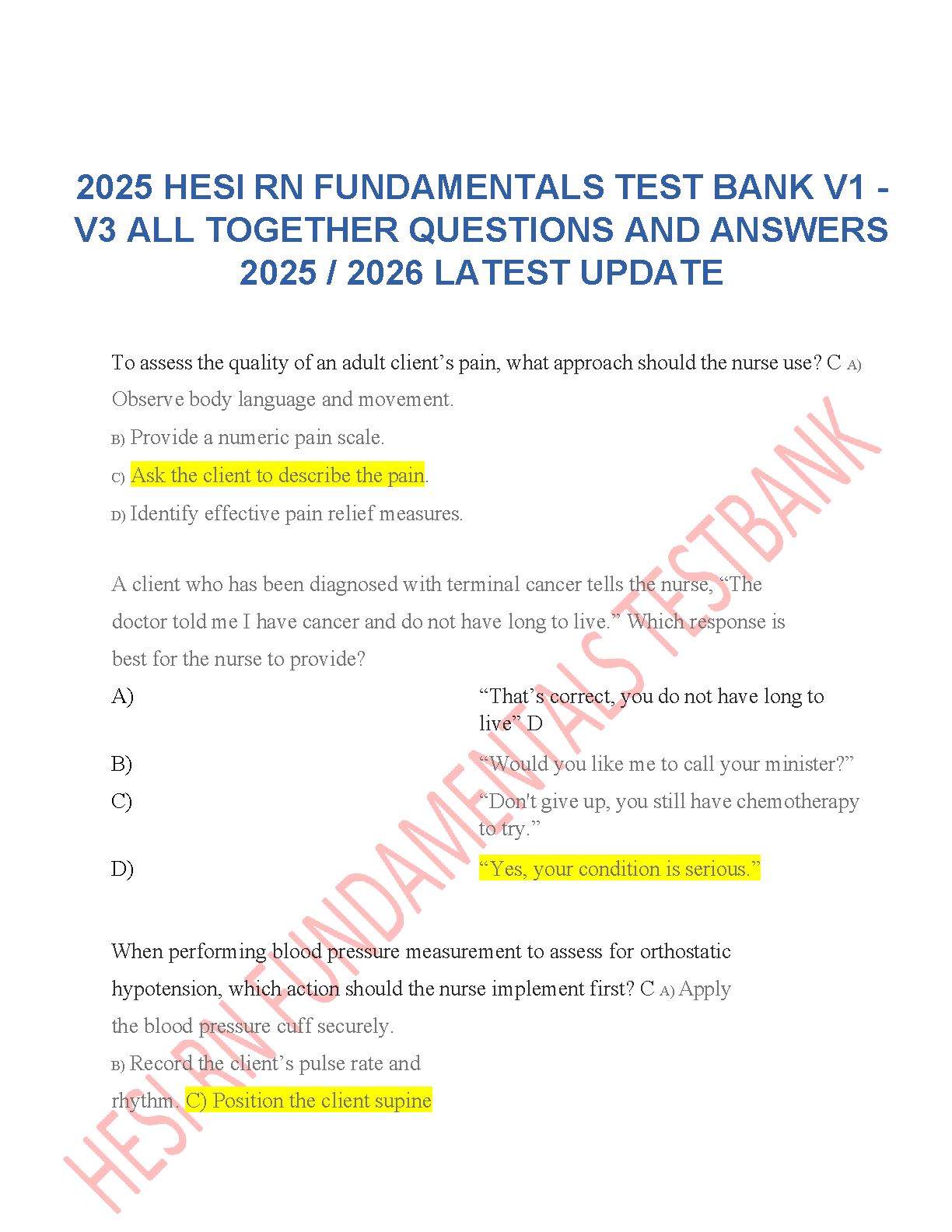 Ace your HESI RN Fundamentals exam with our ultimate 2025-2026 test bank! This comprehensive resource combines Versions 1, 2, and 3, providing a complete collection of practice questions with verified, correct answers. Designed to help nursing students master core concepts and build confidence, this test bank is your key to passing the HESI exam on the first try. Get the latest, most accurate materials and walk into your exam fully prepared.