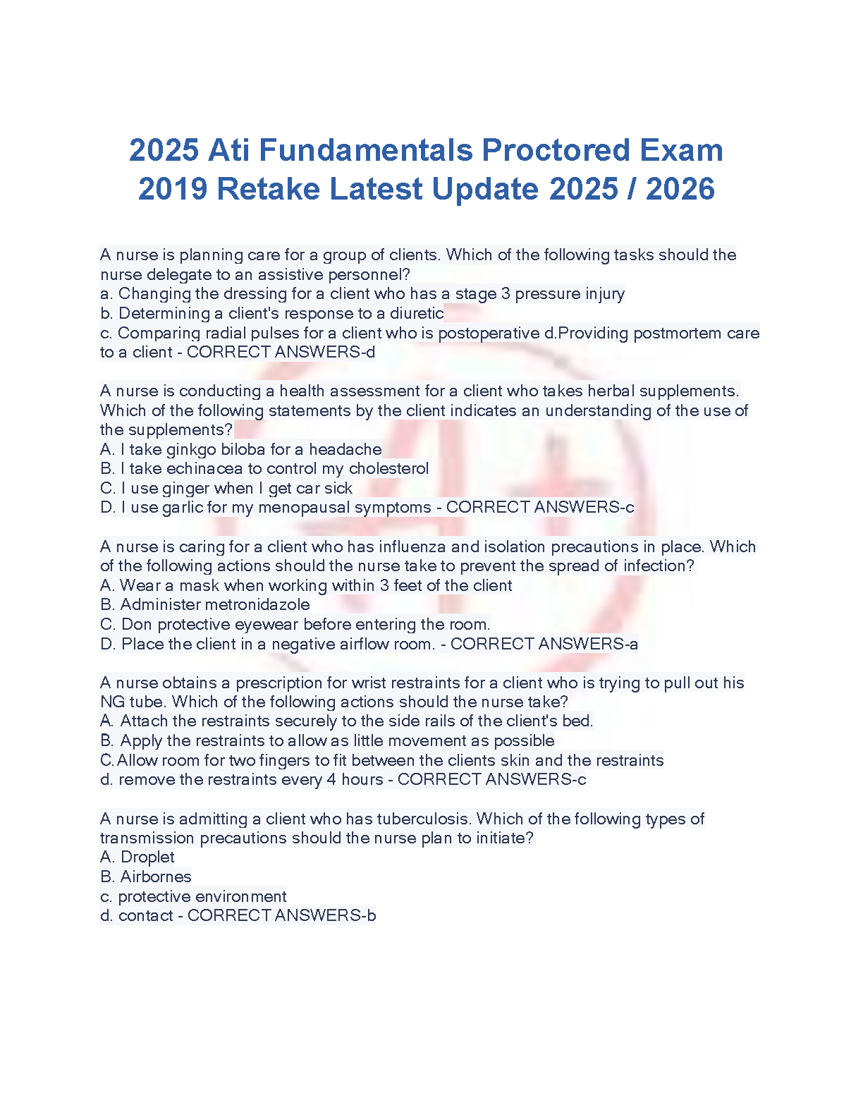 Ace your test with confidence using our latest 2025/2026 comprehensive test bank for the ATI Fundamentals Proctored Exam. This essential study resource provides a complete collection of updated exam questions, each paired with a verified correct answer. Designed specifically for nursing students, this guide helps you master key concepts, familiarize yourself with the exam format, and pinpoint areas for improvement. Stop worrying about resits and secure a top grade on your first attempt. Download now and take the first step towards exam success!