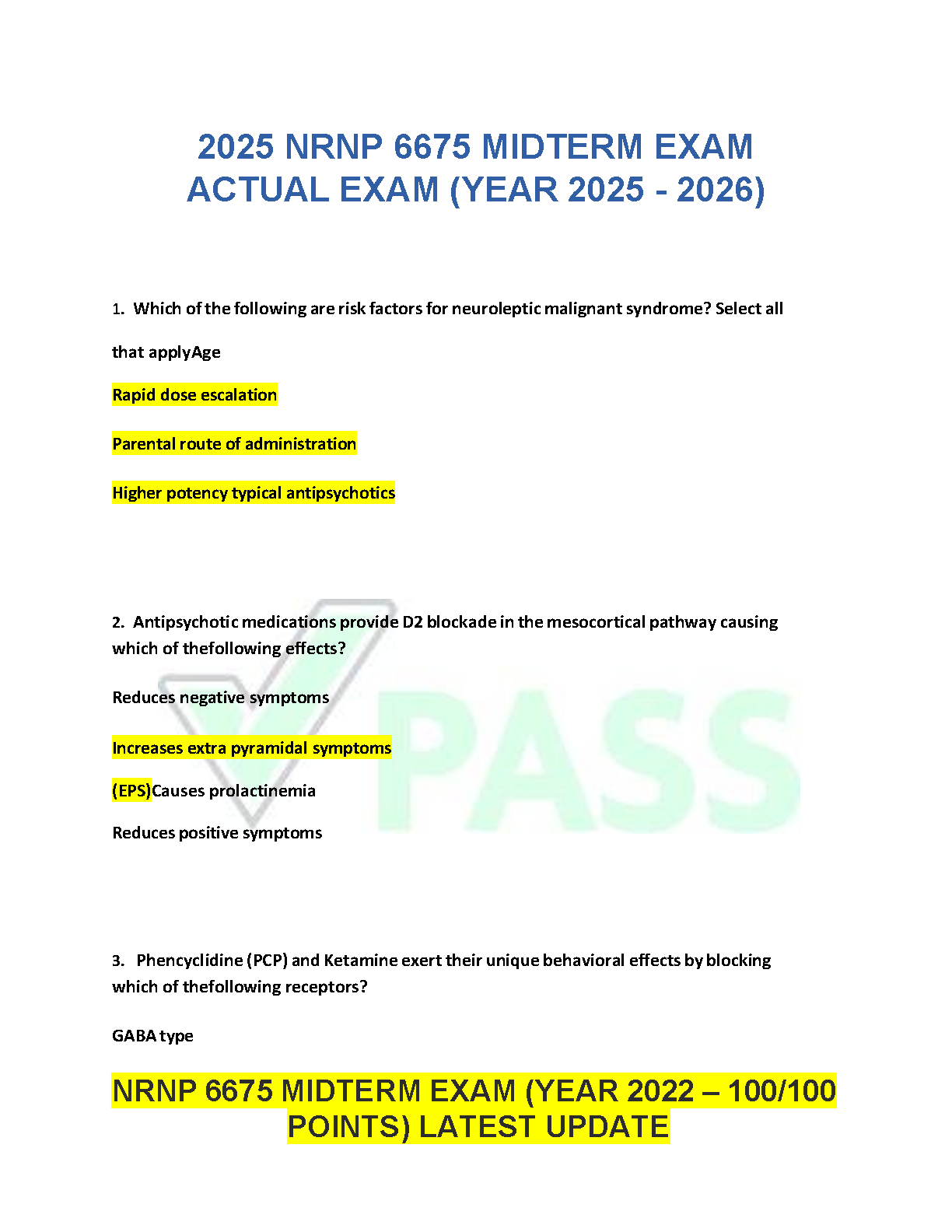 Prepare to excel in your NRNP 6675 Midterm Exam with our newly updated 2025/2026 study resource. This guide provides a complete set of actual exam questions and meticulously verified answers, ensuring you study the most relevant material. Designed for nursing students aiming for top marks, this resource is perfect for mastering key psychopharmacology concepts and building confidence before the test. Pass your exam on the first attempt and avoid resits with this essential study tool.