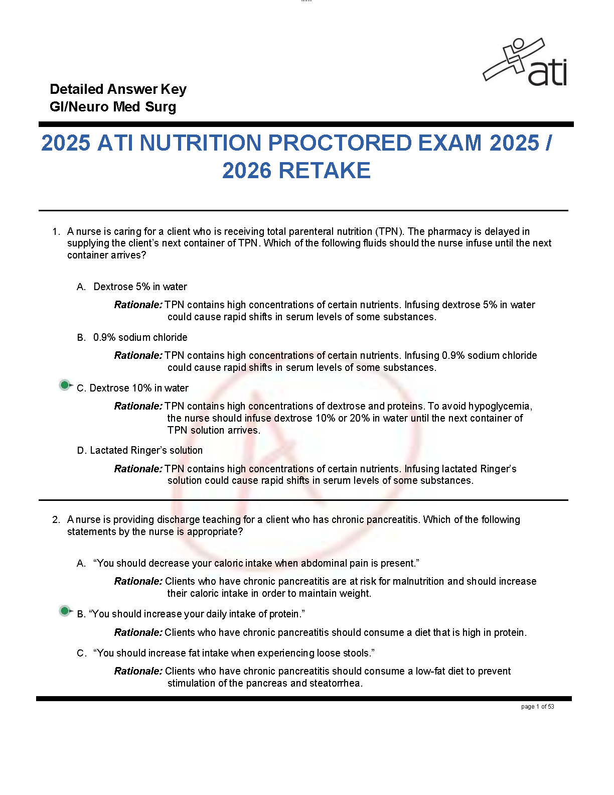Ace your ATI Nutrition Proctored Exam with our latest 2025/2026 retake study guide. This comprehensive resource provides a detailed answer key with in-depth rationales for every question, covering essential topics to ensure your success. Designed specifically to help you understand the core concepts and master the material, this guide is your key to passing the exam on your first attempt. Boost your confidence, avoid costly retakes, and achieve your academic goals with this essential study tool.