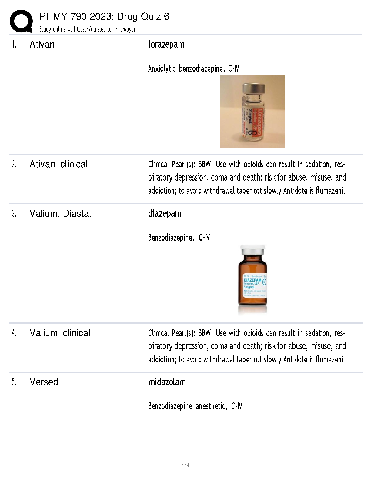 PHMY 790 Drug Quiz 6 Test Bank (2023 Edition): Benzodiazepines - Ativan, Valium, Versed | Questions and Correct Answers