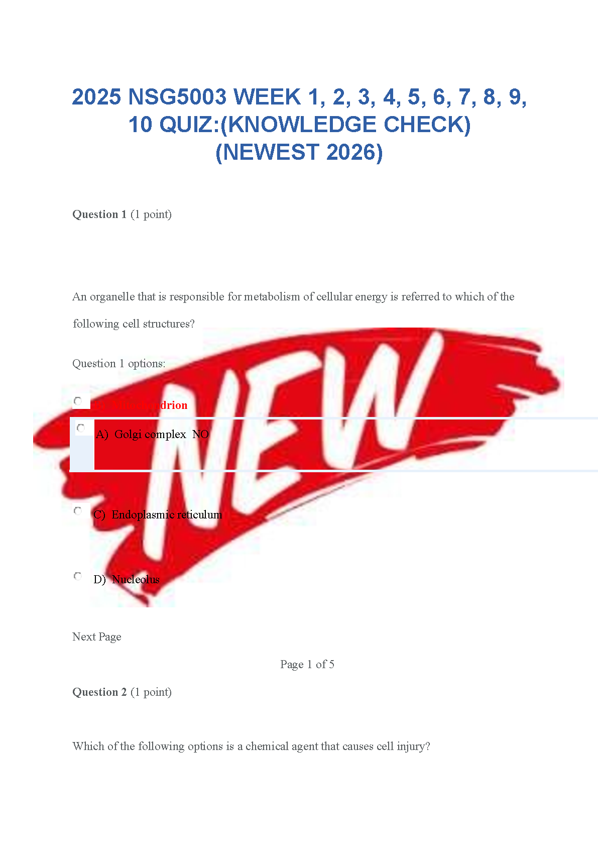 Ace your NSG5003 course with our comprehensive quiz bundle! This complete package includes all Knowledge Check quizzes from Week 1 through Week 10. Each quiz is meticulously compiled with verified questions and answers, covering all essential topics from the course. Stay ahead in your studies with the latest 2025/2026 updated material, designed to help you master key concepts, test your understanding, and pass your exams with confidence on the first try.
