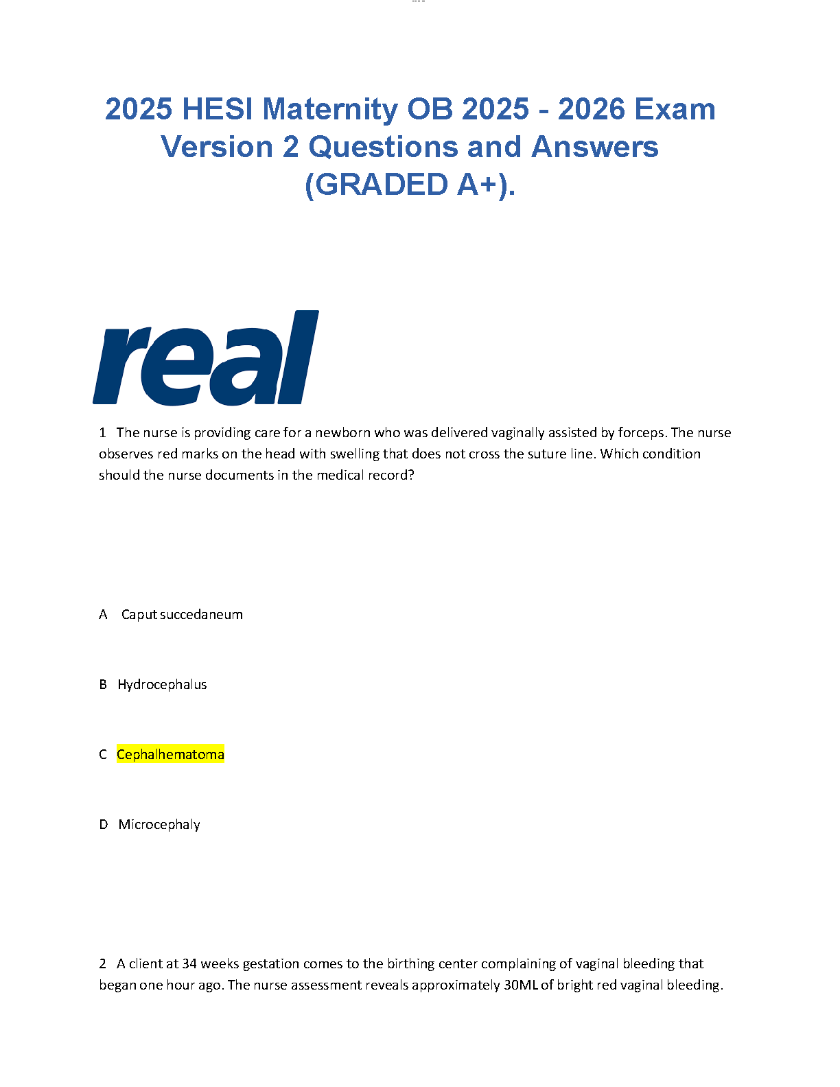 Ace your nursing exams with the ultimate study guide for the HESI Maternity OB V2 Exam for the 2025-2026 academic year. This comprehensive test bank is packed with the latest, real exam questions and detailed, verified answers, all curated to guarantee you an A+ grade. Designed specifically for nursing students, this resource covers all key topics in maternity and obstetrics, helping you build confidence and master the material. Stop worrying about resits and secure your success on the first attempt. Download now to get the A+ edge on your HESI exam!