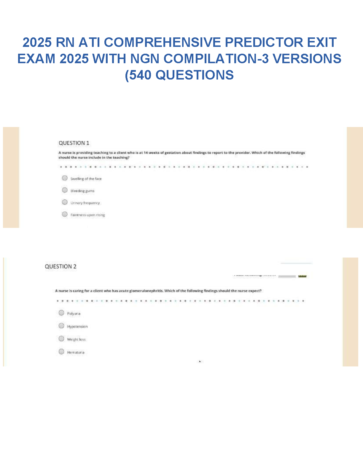 Ace your nursing finals with the definitive 2025 ATI RN Comprehensive Predictor Exit Exam Test Bank. This essential study resource, fully updated for the Next Generation (NGN) format, provides an extensive compilation of 540 unique questions spread across three complete versions. Each question is designed to mirror the actual exam, helping you master critical concepts, improve your clinical judgment, and build confidence. Prepare effectively, identify your weak areas, and ensure you pass the ATI Predictor on your very first try. This is your ultimate tool for success in becoming a Registered Nurse.