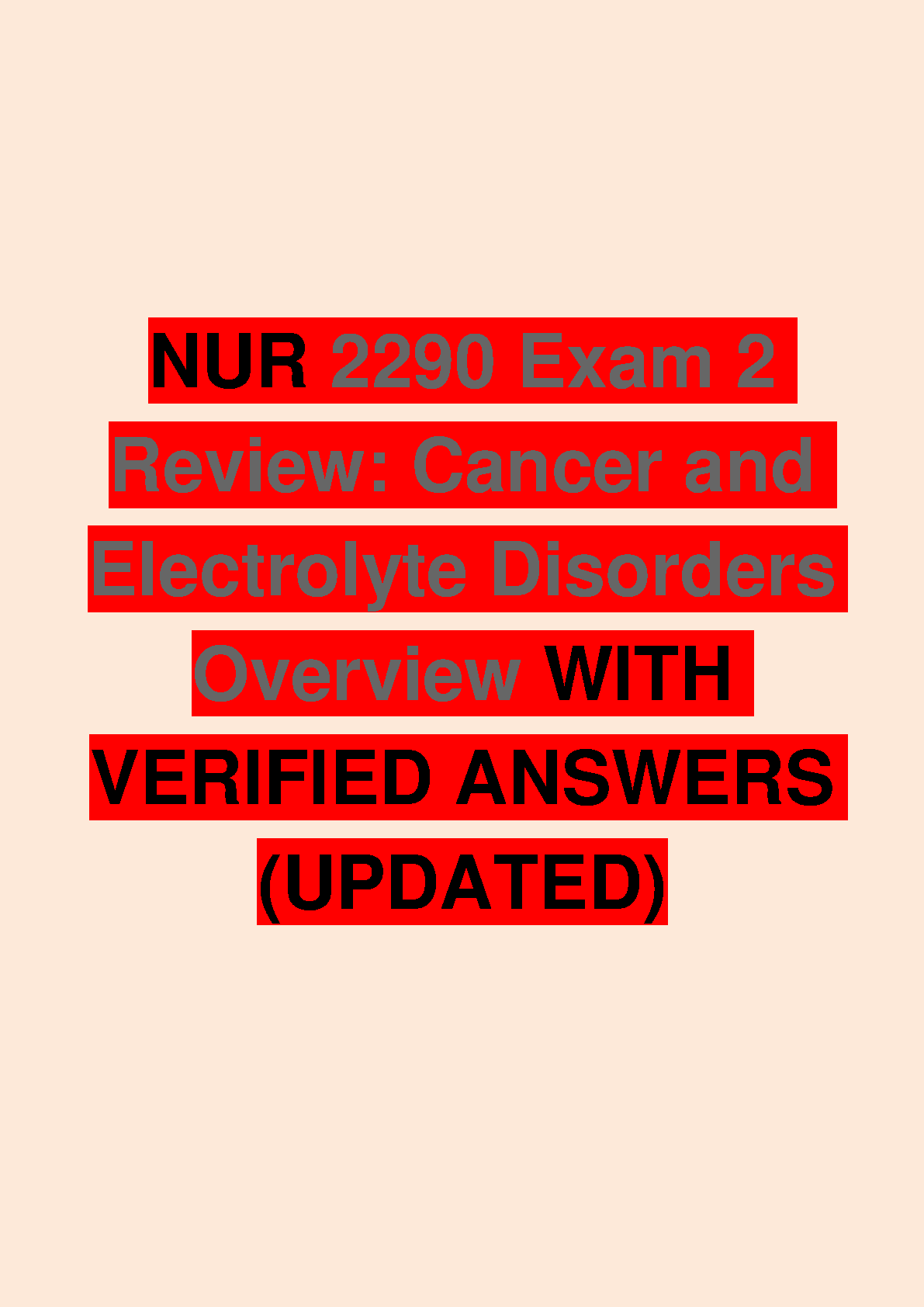 Struggling with complex topics like cancer and electrolyte disorders for your NUR 2290 Exam 2? This is the ultimate study resource you need. Our newly updated 2025/2026 exam review provides a detailed overview of all key concepts, complete with verified answers to ensure you're studying the right information. This comprehensive guide is designed to simplify difficult subjects, boost your confidence, and provide the clarity needed to excel. Prepare effectively, master the material, and pass your exam on the first try, avoiding the stress of resits. Download now and take the first step towards acing your nursing exam!