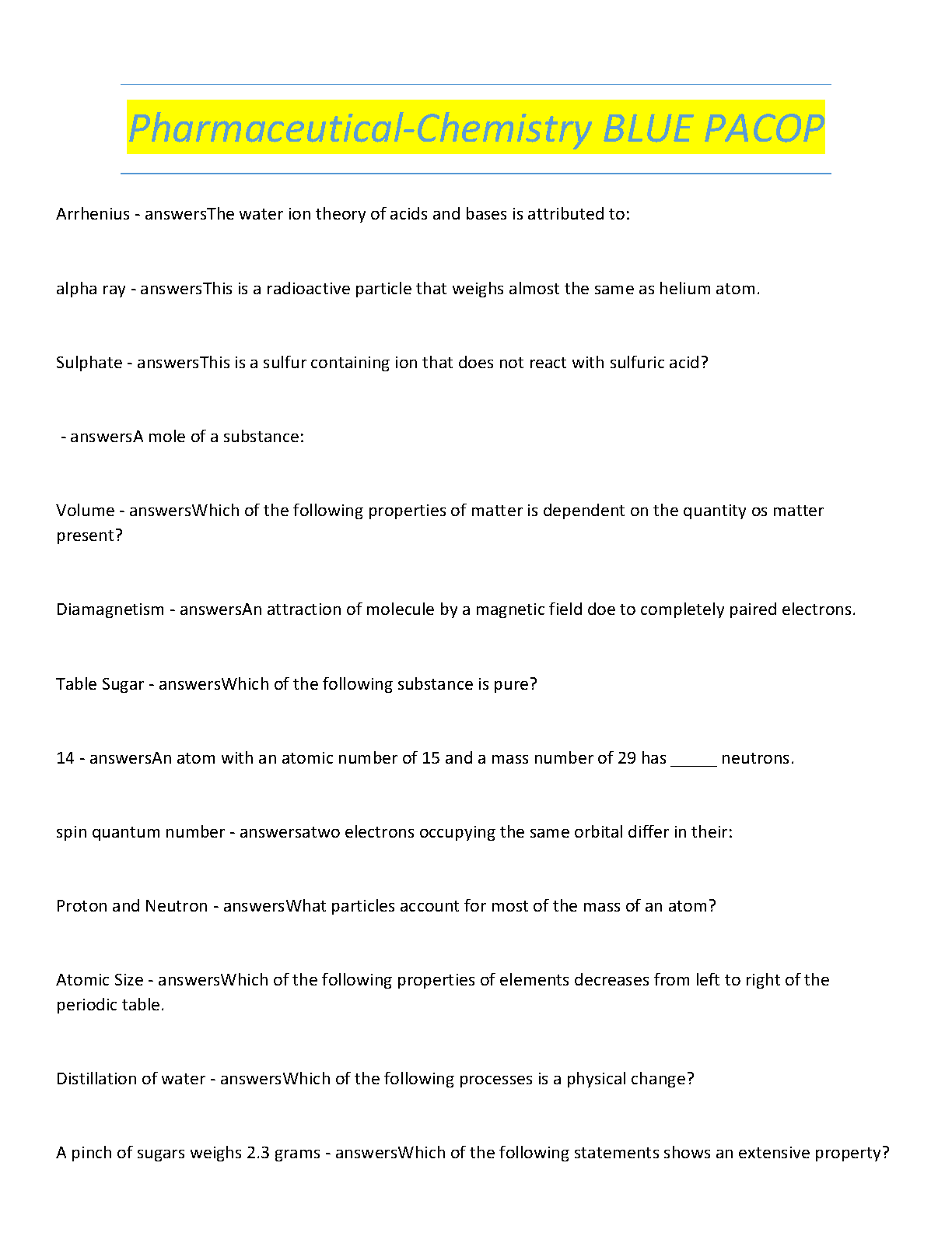 Master the Pharmaceutical Chemistry section of your PACOP exam with our comprehensive 'BLUE PACOP' Test Bank, fully updated for the 2025/2026 academic year. This essential study guide features a vast collection of exam-style questions paired with direct, accurate answers, covering fundamental topics from atomic structure and chemical properties to acid-base theories. Designed specifically to help pharmacy students ace their qualifying exams and avoid resits, this resource is your key to building confidence and achieving success on your first try. Download now and start your journey towards licensure!