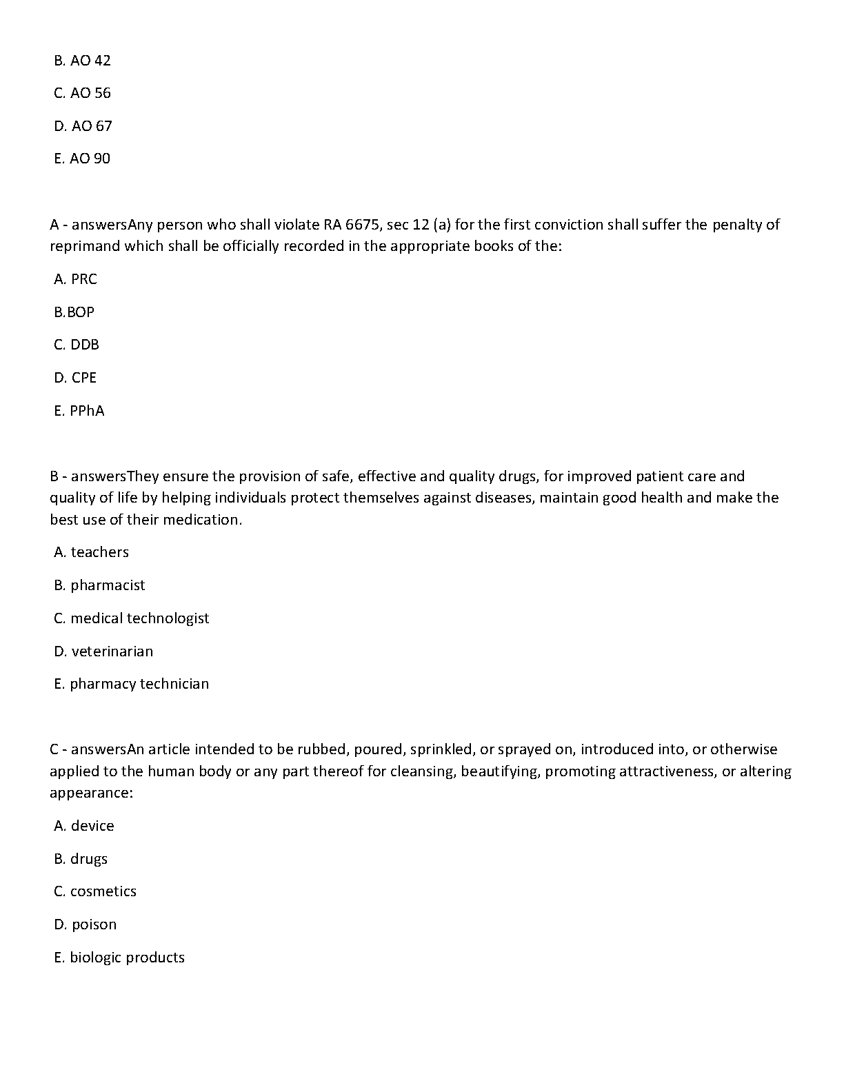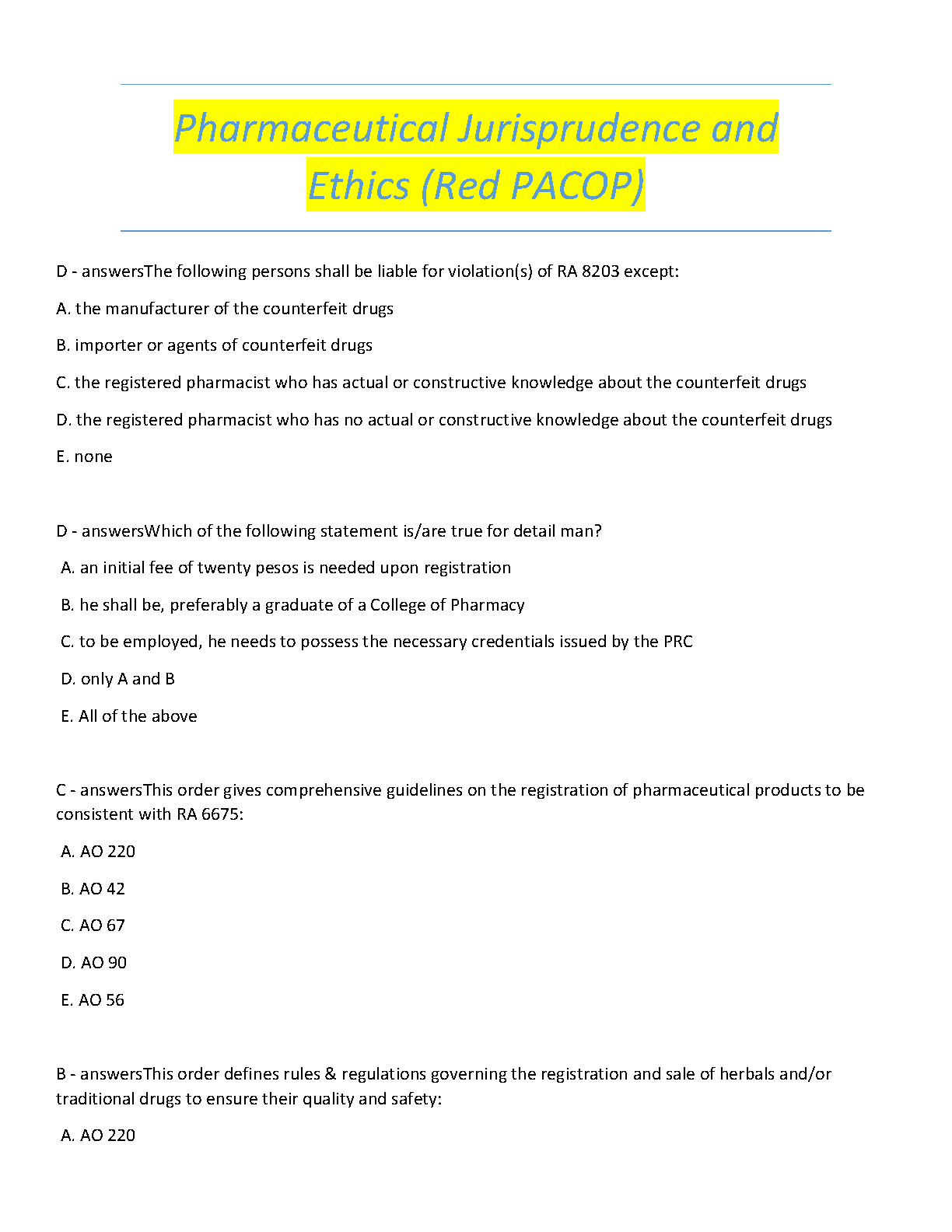 Ace your Pharmacy Board Exam with this comprehensive test bank for Pharmaceutical Jurisprudence and Ethics, based on the highly-regarded Red PACOP reviewer. This resource provides a vast collection of multiple-choice questions (MCQs) complete with the correct answers, covering critical topics like Philippine pharmacy laws (RA 8203, RA 6675), regulations, and ethical standards. Designed to sharpen your knowledge and test-taking skills, this study guide is your ultimate tool to master the subject, build confidence, and pass your licensure exam on the very first try. Avoid resits and secure your future as a licensed pharmacist with this essential exam preparation material.