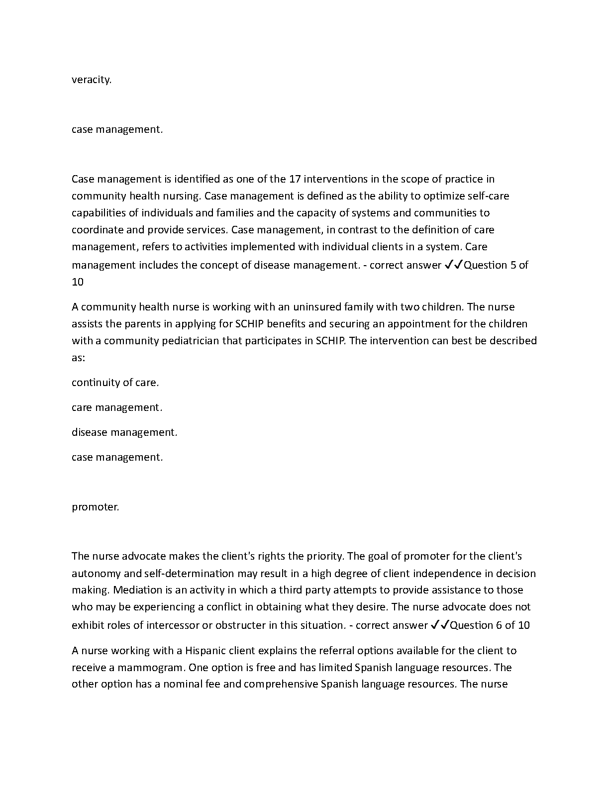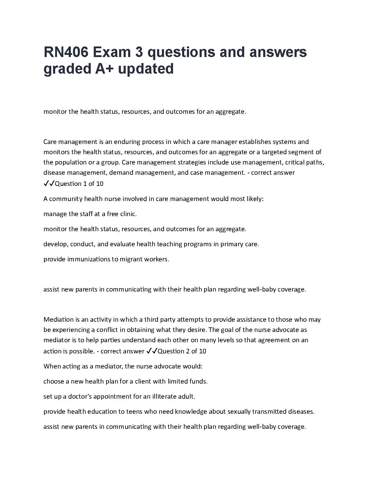 Ace your RN406 Exam 3 with our meticulously compiled test bank. This comprehensive resource features a full set of questions and detailed, correct answers, designed to help you achieve an A+ grade. Covering essential topics such as care management, the role of the community health nurse, and mediation, this study guide provides the clarity and practice you need to master the course material. Download now for an updated, reliable tool to ensure your success in Community Health Nursing.