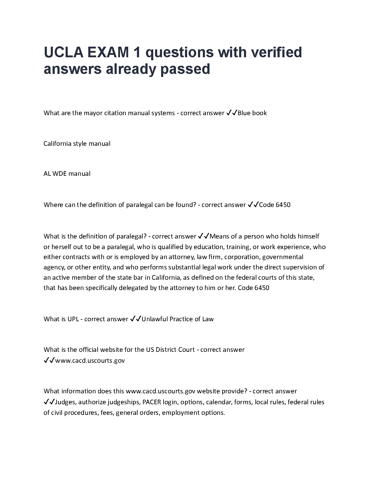 Master the material for your UCLA EXAM 1 with our comprehensive 2025/2026 study guide. This resource provides a complete set of questions paired with expertly verified answers, ensuring you are fully prepared to pass on your first attempt. Dive deep into key legal and paralegal concepts covered in the exam, including major citation manual systems like the Bluebook, the official definition of a paralegal under Code 6450, the concept of Unlawful Practice of Law (UPL), and essential legal resources. Avoid the stress of resits by studying with this proven, up-to-date guide.