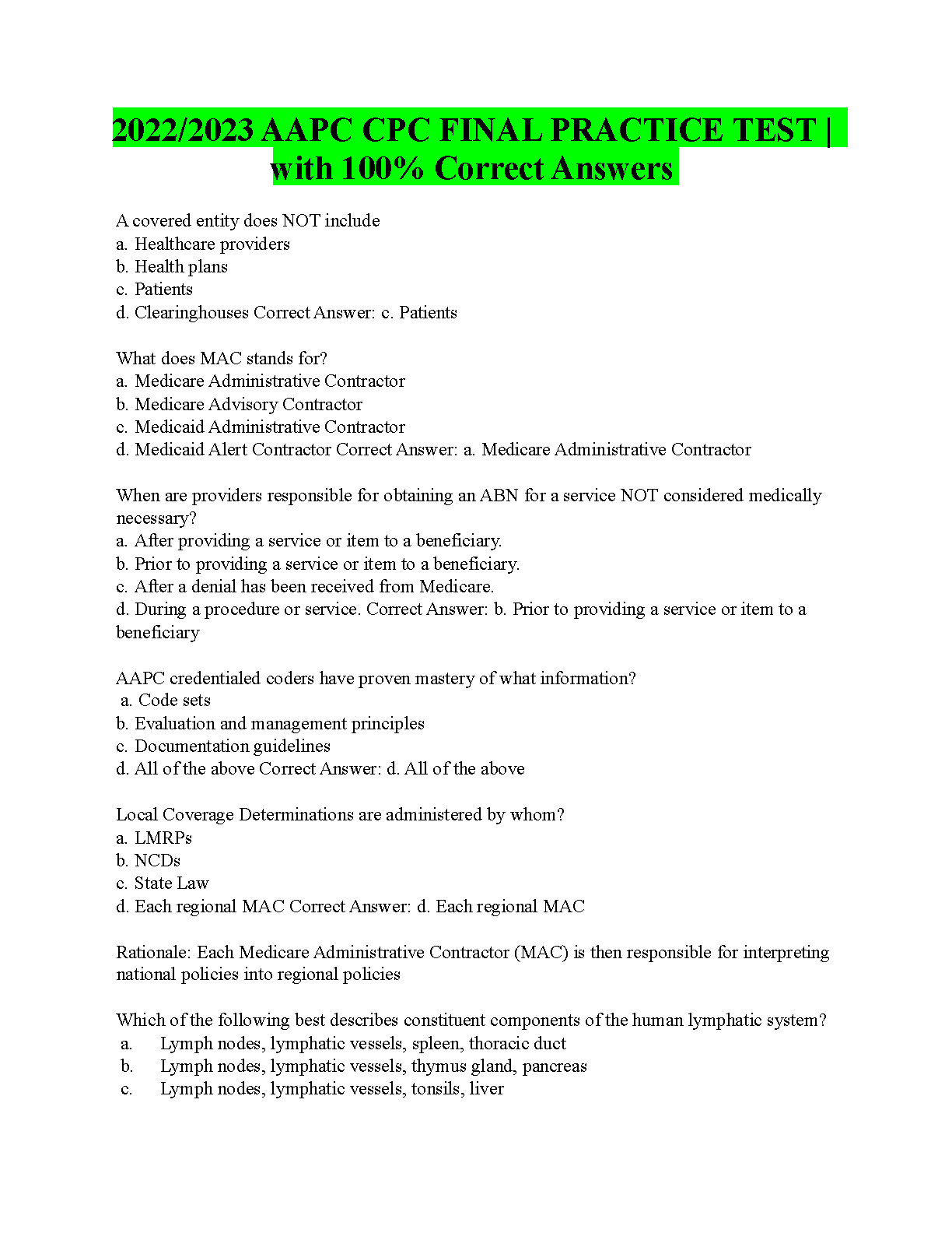 AAPC CPC Final Practice Exam Test Bank 2025/2026: Master the Test with 100% Correct Questions & Answers by the American Academy of Professional Coders (AAPC)