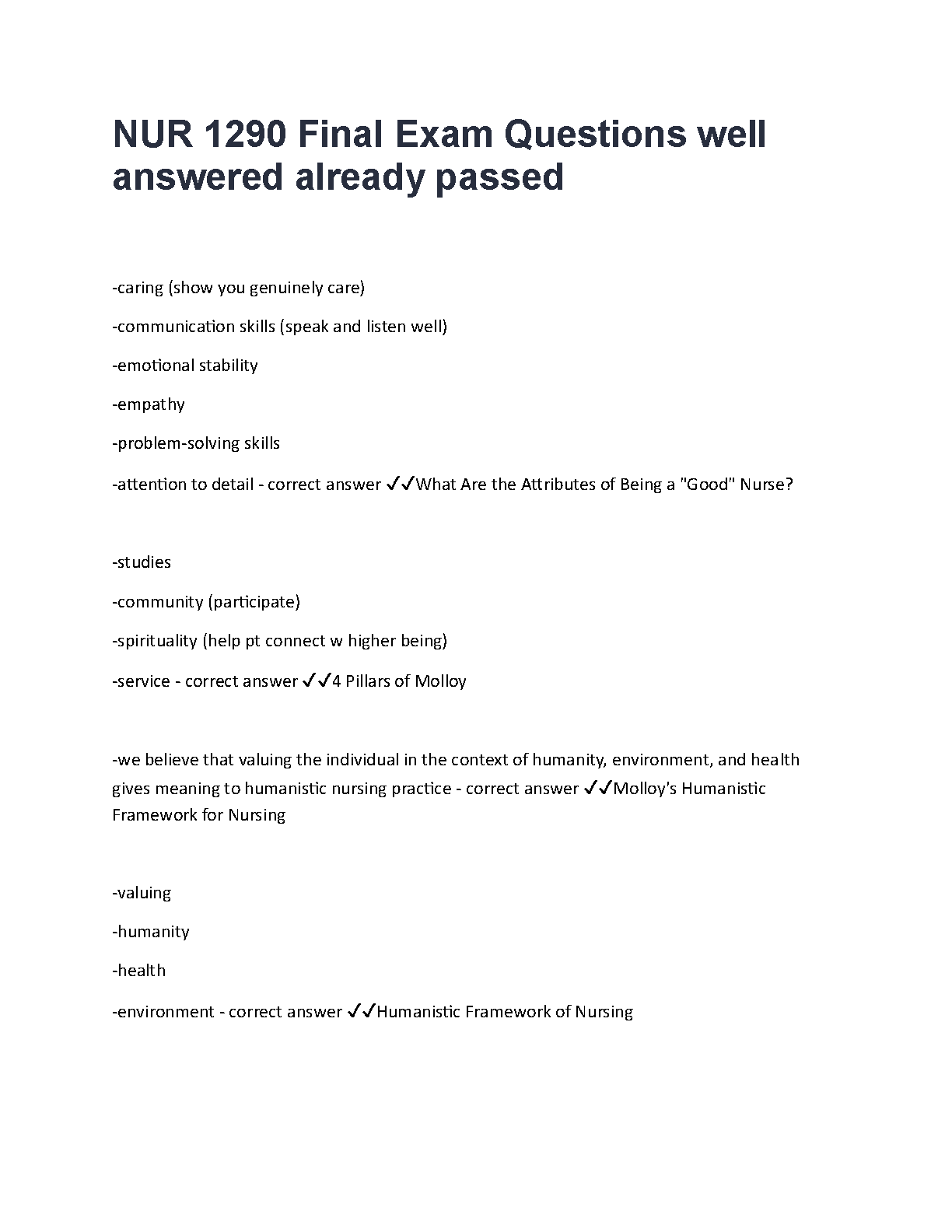 Ace your NUR 1290 final exam with confidence! This comprehensive test bank provides a collection of final exam questions with detailed, well-answered solutions, based on a resource that has already helped students pass. Master key concepts such as the Attributes of a 'Good' Nurse, the 4 Pillars of Molloy, and Molloy's Humanistic Framework for Nursing. Updated for the 2025/2026 academic year, this study guide is your ultimate tool to understand complex topics, practice effectively, and pass your final exam on the first attempt. Avoid resits and secure your grade with these proven answers.