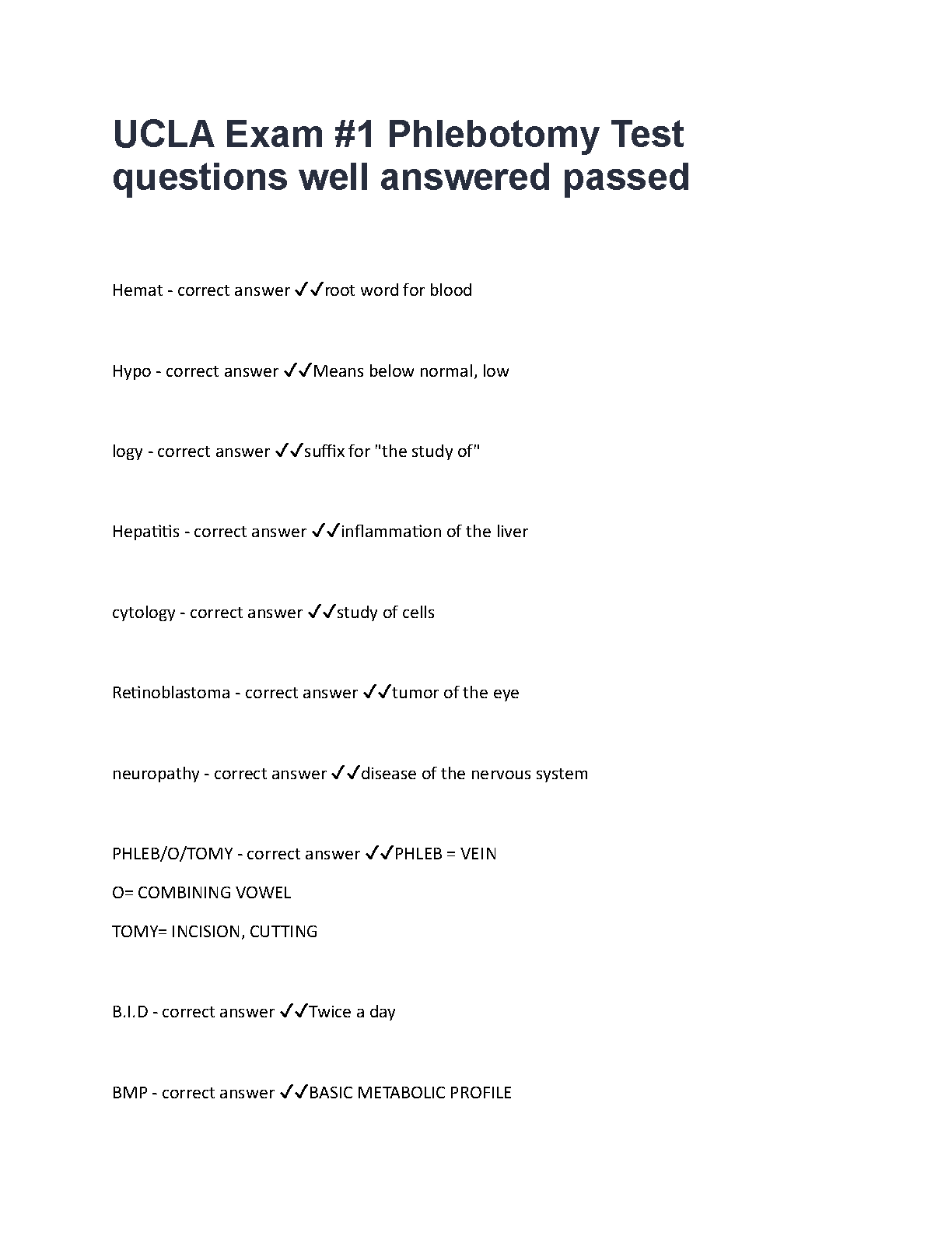 Guarantee your success in your UCLA Phlebotomy course with this ultimate study guide for Exam #1. Updated for the 2025/2026 academic year, this resource contains a comprehensive collection of essential test questions and key terminologies, complete with verified, correct answers. Easily master foundational concepts, from root words and medical abbreviations (BMP, B.I.D) to the breakdown of complex terms like Phlebotomy. This is the perfect tool to help you study effectively and ace your exam on the first try, ensuring you pass with confidence.