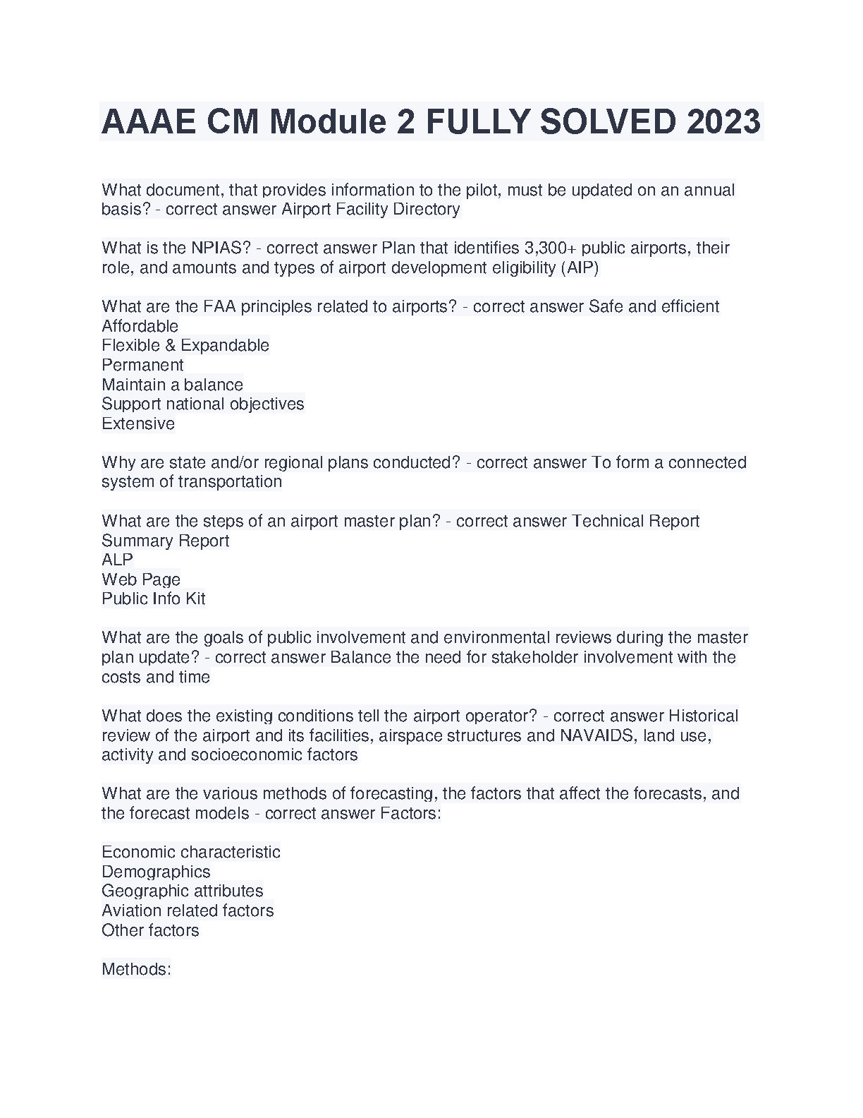 Prepare to ace your AAAE Certified Member exam with our comprehensive test bank for Module 2. This resource, updated for the 2025/2026 syllabus, provides a complete set of fully solved questions and answers covering essential topics like the National Plan of Integrated Airport Systems (NPIAS), FAA principles, airport master planning, and forecasting methods. Study efficiently and effectively with this ultimate tool, designed to help you pass the AAAE CM Module 2 exam on your first attempt and gain the confidence you need for success.
