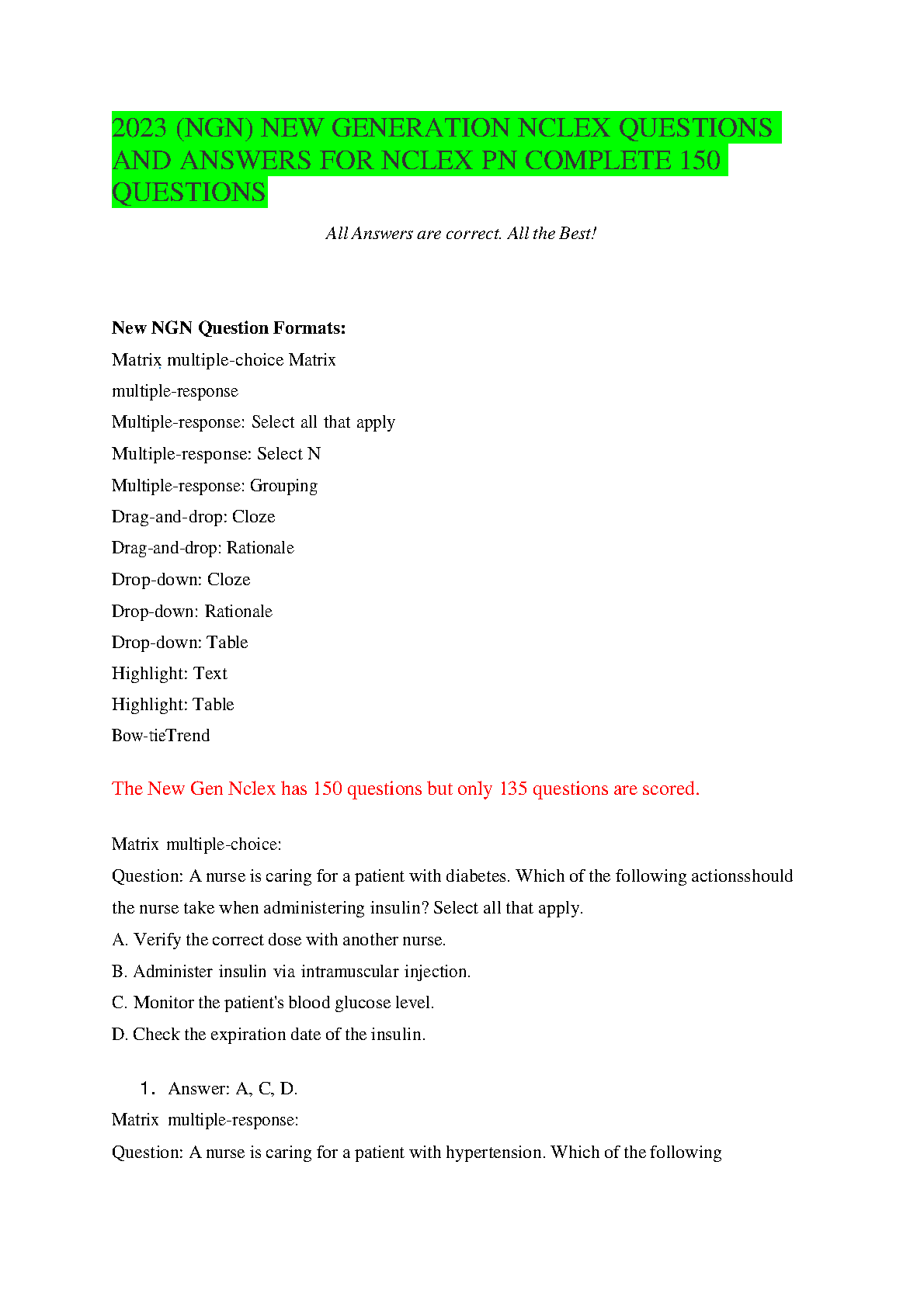 Get ready to ace the Next Generation NCLEX-PN exam with our latest 2025/2026 edition test bank! This comprehensive resource features 150 meticulously crafted practice questions complete with verified answers, designed to mirror the actual exam. Master all the new NGN question formats, including Matrix Multiple-Choice, Select All That Apply, Drag-and-Drop, Cloze, Bow-tie, and more. This study guide is your key to understanding the updated testing style, building confidence, and passing your nursing boards on the very first attempt. Stop worrying about resits and start your nursing career successfully!