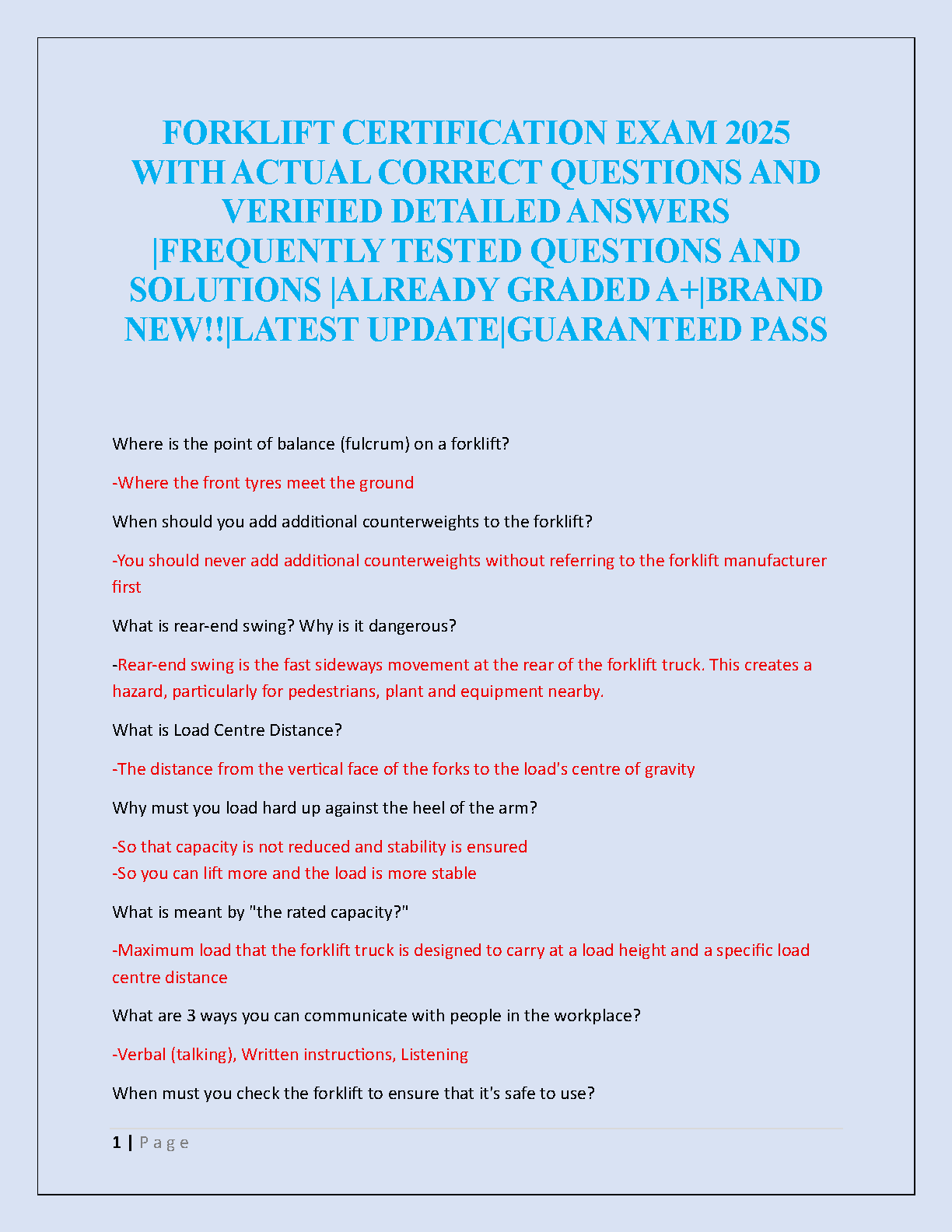 Forklift Certification Exam 2025 Test Bank with Real Questions and Verified Answers